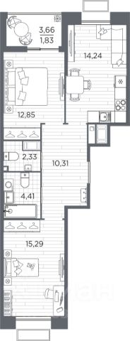 -удобная планировка, две изолированные комнаты 12.54 и 18.35 кв.м соответственно, кухня 7.09 кв.м;