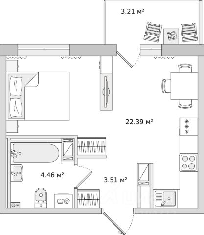 Санузел: раковина с тумбой, ванна или душевая кабина, унитаз, смесители. Выполнена полная разводка электропроводки.
