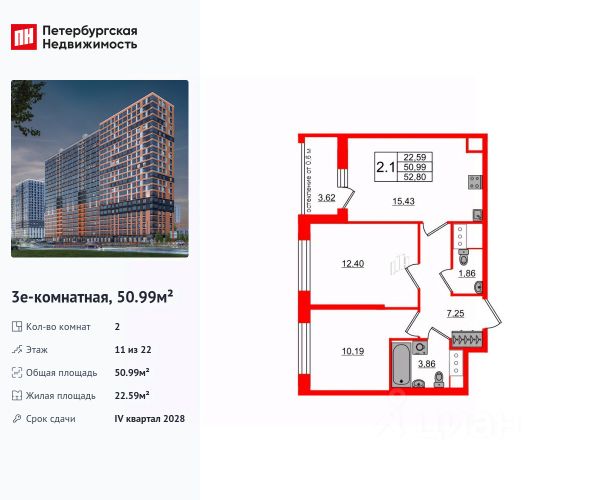 Продается уютная 2-комнатная квартира от застройщика в жилом комплексе "Город звезд" в новом городе на правом берегу Невы. До метро можно добраться на транспорте всего за 13 минут. Удобная, классическая, функциональная европланировка, большая кухня-гостиная 15.43 м², вместительная прихожая 7.25 м². Общая площадь квартиры - 50.99 м², жилая 22.59 м², высота потолка 2.77 м. Квартира продается с отделкой "NORD LINE WHITE". Что особенного в ЖК "Город звезд"? • Инновационный Лицей Setl с оригинальной архитектурной концепцией и уникальной образовательной средой • Невский лесопарк под окнами - всегда свежий воздух и полноценный отдых на природе • Четыре тематические площади отдыха с разнообразным благоустройством • Аллея Звёзд - променад протяженностью 5 км с ландшафтным озеленением, зонами отдыха и велодорожкой • Выход на набережную реки Утки, где можно порыбачить или взять напрокат лодку • Единая входная группа с ресепшен и подземный паркинг