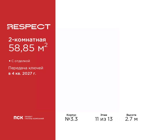 Двухкомнатная квартира от застройщика с предчистовой отделкой в ЖК "RESPECT" на 11 этаже. Общая площадь: 61.74 кв.м., жилая: 28.48 кв.м., площадь просторной кухни-столовой: 14.47 кв.м. Комнаты изолированные, все окна выходят на одну сторону. В квартире один балкон и одна лоджия, один совмещенный и один раздельный санузел. Высота потолков 2.7 м. Квартира будет сдана с отделкой WHITE BOX, в которую включены следующие виды работ: - заливка стяжки; - установлена система отопления квартиры; - подготовлены потолки; - все стены выровнены, загрунтованы и отштукатурены; - электрическая проводка разведена по комнатам. Квартира будет готова к чистовой отделке. Дом монолитный, многоподъездный, переменной этажности, от 10 до 13 этажей. Квартира находится в 1-й секции высотой 13 этажей в корпусе 3.2. На этаже 5 квартир. В подъезде 1 пассажирский и 1 грузовой лифт. Начало строительства - 3 квартал 2025 года. Окончание строительства - 4 квартал 2027 года. Оформление сделки по договору долевого участия. В шаговой доступности от жилого комплекса имеются станции метро (расстояние по прямой): "Лесная" (800 м), "Площадь Мужества" (1.4 км), "Выборгская" (1.9 км), также недалеко от этого корпуса расположены станции метро: "Академическая", "Политехническая". Квартал строится на Полюстровском пр, 87, в одной из самых востребованных локаций Петербурга. В 10 минутах пешком - метро "Лесная" и в 10 минутах на транспорте - Петроградская сторона. Высота домов от 7 до 13 этажей. На территории Respect строится школа на 1125 учащихся и детский сад на 240 мест. Запроектированы собственная газовая котельная, закрытая территория, дворы без машин и подземные паркинги с лифтами. Вентилируемые фасады облицованы клинкерным кирпичом. Дома из этого материала служат веками, являясь гордостью хозяев. Дизайн парадных зон и входных групп - сочетание лаконичности отделки и декоративных элементов с текстурами из натурального камня и дерева с приглушенной подсветкой теплым светом. Во входных группах расположены гостевые зоны с мягкой мебелью. Вся территория квартала будет связана единой концепцией благоустройства, разработанной ландшафтным бюро L.BURO. В основе - идея создания увлекательного ландшафтного пространства для насыщенной жизни, включающего в себя пейзажные зоны, современные архитектурные композиции, открытые террасы на стилобатах с зонами отдыха и парклетами, спортивными площадками. Это пространство для людей всех возрастов и различных увлечений. На эксплуатируемой кровле на уровне первого этажа в домах 1 и 4 будут обустроены общественные видовые террасы. В квартале запроектированы внутренние закрытые территории дворов домов без доступа автомобилей и безбарьерная среда для велосипедистов и колясок. Предусмотрены IP-домофония с функцией дистанционного открывания калиток и парадных, а также дистанционный сбор показаний счетчиков и мобильное приложение для жителей. Для безопасности жителей квартала - круглосуточное видеонаблюдение и служба охраны. В каждой квар