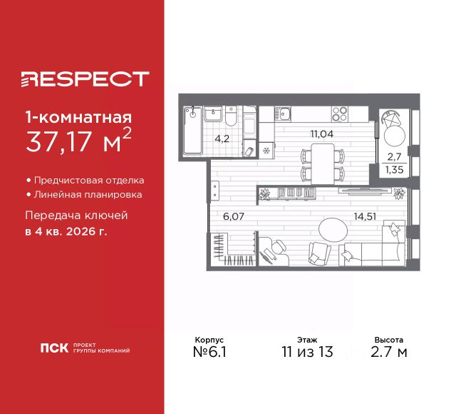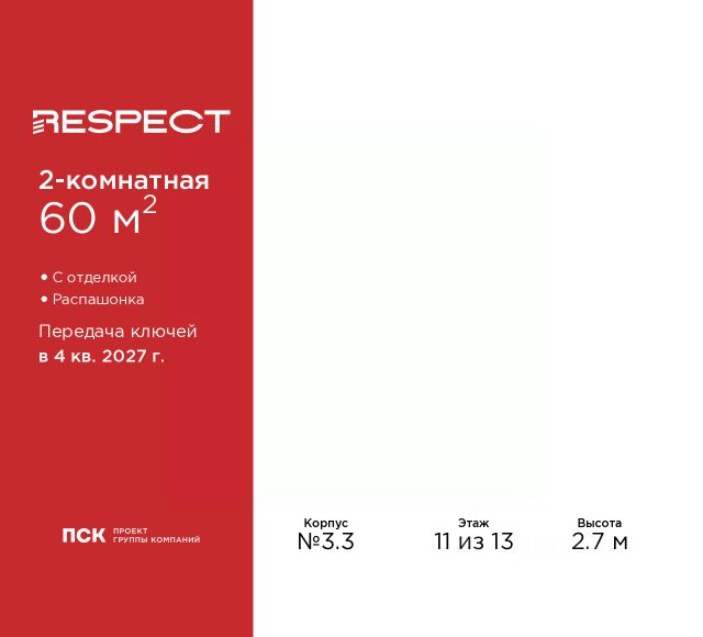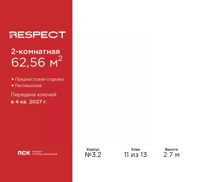 Двухкомнатная квартира от застройщика с предчистовой отделкой в ЖК "RESPECT" на 11 этаже. Общая площадь: 61.74 кв.м., жилая: 28.48 кв.м., площадь просторной кухни-столовой: 14.47 кв.м. Комнаты изолированные, все окна выходят на одну сторону. В квартире один балкон и одна лоджия, один совмещенный и один раздельный санузел. Высота потолков 2.7 м. Квартира будет сдана с отделкой WHITE BOX, в которую включены следующие виды работ: - заливка стяжки; - установлена система отопления квартиры; - подготовлены потолки; - все стены выровнены, загрунтованы и отштукатурены; - электрическая проводка разведена по комнатам. Квартира будет готова к чистовой отделке. Дом монолитный, многоподъездный, переменной этажности, от 10 до 13 этажей. Квартира находится в 1-й секции высотой 13 этажей в корпусе 3.2. На этаже 5 квартир. В подъезде 1 пассажирский и 1 грузовой лифт. Начало строительства - 3 квартал 2025 года. Окончание строительства - 4 квартал 2027 года. Оформление сделки по договору долевого участия. В шаговой доступности от жилого комплекса имеются станции метро (расстояние по прямой): "Лесная" (800 м), "Площадь Мужества" (1.4 км), "Выборгская" (1.9 км), также недалеко от этого корпуса расположены станции метро: "Академическая", "Политехническая". Квартал строится на Полюстровском пр, 87, в одной из самых востребованных локаций Петербурга. В 10 минутах пешком - метро "Лесная" и в 10 минутах на транспорте - Петроградская сторона. Высота домов от 7 до 13 этажей. На территории Respect строится школа на 1125 учащихся и детский сад на 240 мест. Запроектированы собственная газовая котельная, закрытая территория, дворы без машин и подземные паркинги с лифтами. Вентилируемые фасады облицованы клинкерным кирпичом. Дома из этого материала служат веками, являясь гордостью хозяев. Дизайн парадных зон и входных групп - сочетание лаконичности отделки и декоративных элементов с текстурами из натурального камня и дерева с приглушенной подсветкой теплым светом. Во входных группах расположены гостевые зоны с мягкой мебелью. Вся территория квартала будет связана единой концепцией благоустройства, разработанной ландшафтным бюро L.BURO. В основе - идея создания увлекательного ландшафтного пространства для насыщенной жизни, включающего в себя пейзажные зоны, современные архитектурные композиции, открытые террасы на стилобатах с зонами отдыха и парклетами, спортивными площадками. Это пространство для людей всех возрастов и различных увлечений. На эксплуатируемой кровле на уровне первого этажа в домах 1 и 4 будут обустроены общественные видовые террасы. В квартале запроектированы внутренние закрытые территории дворов домов без доступа автомобилей и безбарьерная среда для велосипедистов и колясок. Предусмотрены IP-домофония с функцией дистанционного открывания калиток и парадных, а также дистанционный сбор показаний счетчиков и мобильное приложение для жителей. Для безопасности жителей квартала - круглосуточное видеонаблюдение и служба охраны. В каждой квар