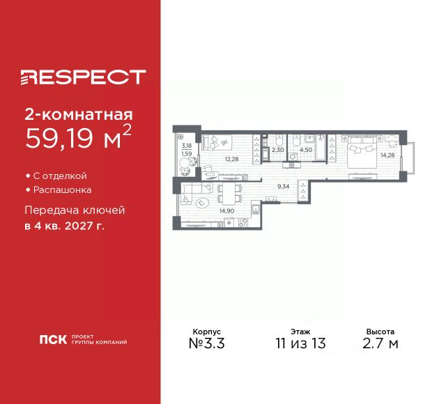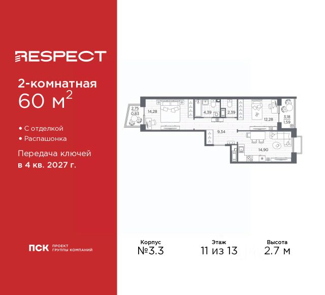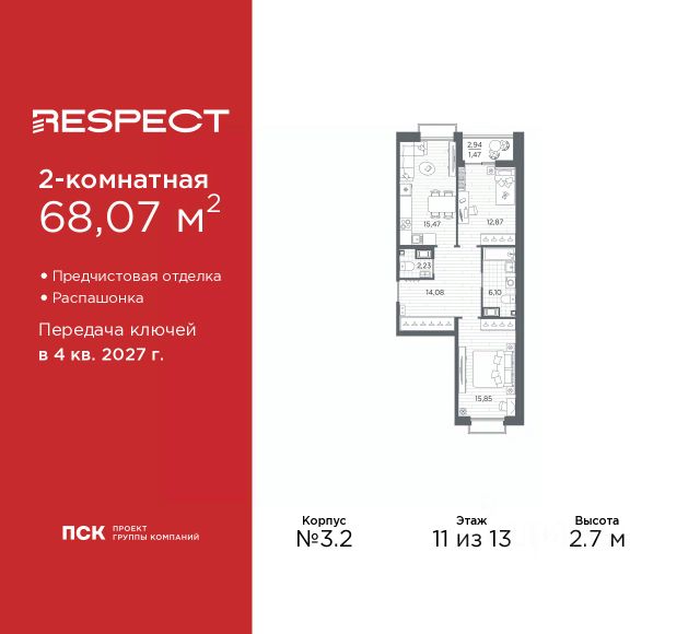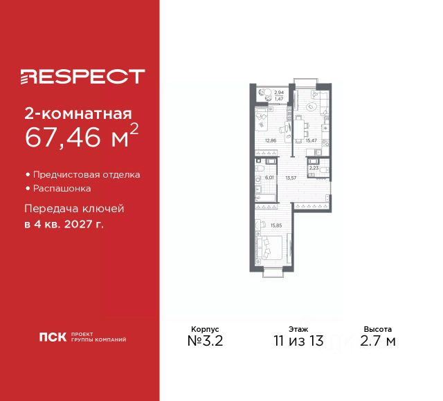 Продается двухкомнатная квартира от застройщика с отделкой в ЖК "RESPECT" на 11 этаже. Общая площадь: 56.75 кв.м., жилая: 26.42 кв.м., площадь просторной кухни-столовой: 14.11 кв.м. Квартира без проходных комнат, окна выходят нa три cтopoны дома. В квартире одна лоджия, один совмещенный и один раздельный санузел. Высота потолков 2.7 м. Дом монолитный, многоподъездный, переменной этажности, от 8 до 13 этажей. Квартира находится в 1-й секции высотой 13 этажей в корпусе 3.3. На этаже 6 квартир. В подъезде 1 пассажирский и 1 грузовой лифт. Начало строительства - 3 квартал 2025 года. Окончание строительства - 4 квартал 2027 года. Оформление сделки по договору долевого участия. В шаговой доступности от жилого комплекса находятся станции метро (расстояние по прямой): "Лесная" (800 м), "Площадь Мужества" (1.4 км), "Выборгская" (1.9 км), также недалеко от этого корпуса находятся станции метро: "Академическая", "Политехническая". Жилой квартал "RESPECT" строится на Полюстровском пр, 87, в одной из самых востребованных локаций Петербурга. В 10 минутах пешком - метро "Лесная" и в 10 минутах на транспорте - Петроградская сторона. Высота домов от 7 до 13 этажей. Квартиры сдаются с отделкой white box и с чистовой отделкой. На территории Respect строится школа на 1125 учащихся и детский сад на 240 мест. Запроектированы собственная газовая котельная, закрытая территория, дворы без машин и подземные паркинги с лифтами. В проекте предусмотрены трапециевидные балконы или остекленные лоджии, которые, с одной стороны, исключают монотонность фасада, являясь декоративными элементами, с другой дополнительным функциональным пространством в квартирах. Цветовая гармония фасадов каждого дома раскрывает характер квартала. Коричневый цвет клинкерного кирпича со структурой водяных штрихов — цвет уюта и безопасности, сдержанности и надёжности. Вентилируемые фасады облицованы клинкерным кирпичом. Его высокая прочность позволяет давать 100 лет гарантии на этот материал. Водопоглощение клинкерного кирпича составляет менее 5%, за счет чего у него высокая теплопроводность и прочность. В квартале запроектированы внутренние закрытые территории дворов домов без доступа автомобилей и безбарьерная среда для велосипедистов и колясок. Предусмотрены IP-домофония с функцией дистанционного открывания калиток и парадных, а также дистанционный сбор показаний счетчиков и мобильное приложение для жителей. Для безопасности жителей квартала - круглосуточное видеонаблюдение и служба охраны. В каждой квартире предусмотрены внешние корзины для кондиционеров. Вся территория квартала будет связана единой концепцией благоустройства, разработанной ландшафтным бюро L.BURO. На эксплуатируемой кровле на уровне первого этажа в домах 1 и 4 будут обустроены общественные видовые террасы. Это станет не только привлекательным местом с красивым видом, но и удобным, многофункциональным пространством. Дизайн парадных зон и входных групп - сочетание лаконичности отделки и декоративных элементов