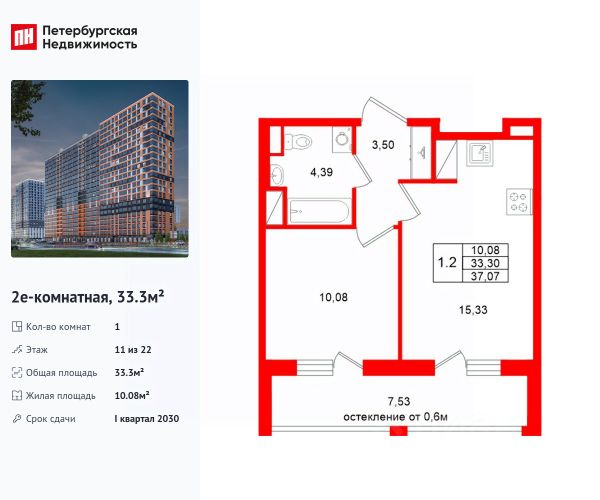 Строим кварталы для жизни с заботой о будущем. Предлагается 1-комнатная квартира комфорт-класса площадью 33,1 кв.м в корпусе 39 на 11-м этаже, в жилом комплексе "Новое Колпино".