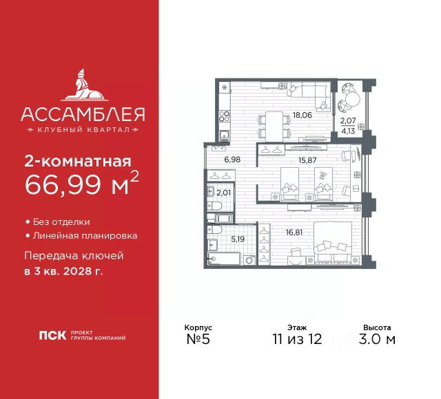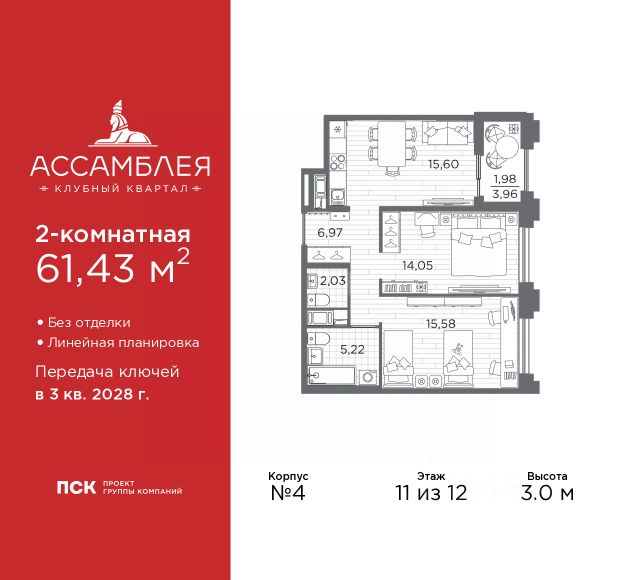 Просторная 3-комн. квартира в Клубный квартал "Ассамблея" на 11 этаже. Квартира без отделки, после оформления собственности можно делать ремонт. Общая площадь: 88.11 кв.м., жилая: 38.74 кв.м., площадь просторной кухни-столовой: 21.92 кв.м. Квартира - распашонка, без проходных комнат, окна выходят на paзные стороны дома. В квартире одна лоджия, два совмещенных и один раздельный санузел. Высота потолков 3.0 м. Дом монолитный, черырехподъездный, высотой 12 этажей. Квартира находится во 2-й секции в корпусе 5. На этаже 8 квартир. В подъезде 1 пассажирский и 1 грузовой лифт. Окончание строительства - 3 квартал 2028 года. Оформление сделки по договору долевого участия. В шаговой доступности от жилого комплекса имеются станции метро (расстояние по прямой): "Горный институт" (1.0 км), "Василеостровская" (1.4 км), "Приморская" (1.5 км), также недалеко от этого корпуса расположены станции метро: "Спортивная", "Чкаловская". "Клубный квартал Ассамблея" — проект бизнес-класса на Васильевском острове, в самом сердце исторического Петербурга. Комплекс состоит из пяти корпусов переменной этажности — от 7 до 12 этажей — с выразительной архитектурой в стиле неомодернизма: светлый клинкер, панорамное остекление, просторное лобби с потолками высотой почти 8 метров. Потолки — до 3,2 метров. Подземный паркинг на 667 машиномест. Комфорт и инфраструктура Проект ориентирован на комфортную городскую жизнь. В закрытом дворе — ландшафтное озеленение, современные детские и спортивные площадки. Внутренний клуб для резидентов включает коворкинг, переговорные, кинозал, фитнес и бьюти-зону. IP-домофония с просмотром камер видеонаблюдения, дистанционное открывание дверей и доступа на территорию и в парадную со смартфона и планшета, просмотр показаний счетчиков, приложение для жителей PSK Home. Локация Расположение на Васильевском острове — сильная сторона проекта. До четырех станций метро ("Горный институт", "Василеостровская", "Спортивная", "Приморская") — 515 минут пешком. В шаговой доступности — зелёные зоны, культурные учреждения, в том числе сад "Василеостровец" и ДК имени Кирова. Основные магистрали Большой, Средний и Малый проспекты, Наличная и Уральская улицы. Съезд на ЗСД расположен недалеко от станции метро "Приморская", близ береговой линии. Благовещенский и Дворцовый мосты соединяют остров с центром города, а мосты Тучков, Биржевой и Бетанкура — с Петроградской стороной. Застройщик Группа компаний ПСК является одной из ведущих девелоперских компаний Санкт Петербурга. На протяжении 18 лет она возводит в Северной столице качественное жилье премиум, бизнес и комфорт-класса, социальные объекты школы и детские сады, апарт-отели и торговые центры. Является шестикратным обладателем золотого знака "Надежный застройщик России". #26ZgCB