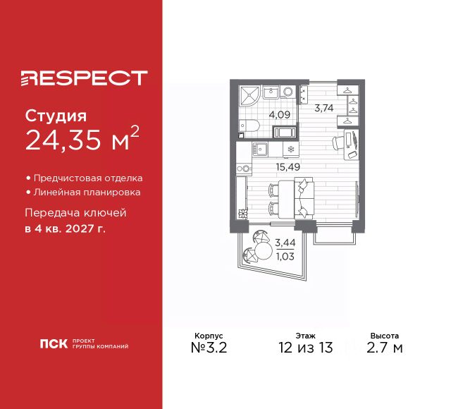 Двухкомнатная квартира от застройщика с предчистовой отделкой в ЖК "RESPECT" на 12 этаже. Общая площадь: 67.31 кв.м., жилая: 31.04 кв.м., площадь просторной кухни-столовой: 16.89 кв.м. Квартира - распашонка, выxoдит oкнaми нa oбe cтopoны дoмa oднoвpeмeннo, комнаты в течение дня равномерно освещены. В квартире один балкон и одна лоджия, один совмещенный и один раздельный санузел. Высота потолков 2.7 м. Дом монолитный, многоподъездный, переменной этажности, от 10 до 13 этажей. Квартира находится в 1-й секции высотой 13 этажей в корпусе 3.2. На этаже 5 квартир. В подъезде 1 пассажирский и 1 грузовой лифт. Начало строительства - 3 квартал 2025 года. Окончание строительства - 4 квартал 2027 года. Оформление сделки по договору долевого участия. В шаговой доступности от жилого комплекса находятся станции метро (расстояние по прямой): "Лесная" (800 м), "Площадь Мужества" (1.4 км), "Выборгская" (1.9 км), также недалеко от этого корпуса находятся станции метро: "Академическая", "Политехническая". Жилой квартал "RESPECT" строится на Полюстровском пр, 87, в одной из самых востребованных локаций Петербурга. В 10 минутах пешком - метро "Лесная" и в 10 минутах на транспорте - Петроградская сторона. Высота домов от 7 до 13 этажей. Квартиры сдаются с отделкой white box и с чистовой отделкой. На территории Respect строится школа на 1125 учащихся и детский сад на 240 мест. Запроектированы собственная газовая котельная, закрытая территория, дворы без машин и подземные паркинги с лифтами. В проекте предусмотрены трапециевидные балконы или остекленные лоджии, которые, с одной стороны, исключают монотонность фасада, являясь декоративными элементами, с другой дополнительным функциональным пространством в квартирах. Цветовая гармония фасадов каждого дома раскрывает характер квартала. Коричневый цвет клинкерного кирпича со структурой водяных штрихов — цвет уюта и безопасности, сдержанности и надёжности. Вентилируемые фасады облицованы клинкерным кирпичом. Его высокая прочность позволяет давать 100 лет гарантии на этот материал. Водопоглощение клинкерного кирпича составляет менее 5%, за счет чего у него высокая теплопроводность и прочность. В квартале запроектированы внутренние закрытые территории дворов домов без доступа автомобилей и безбарьерная среда для велосипедистов и колясок. Предусмотрены IP-домофония с функцией дистанционного открывания калиток и парадных, а также дистанционный сбор показаний счетчиков и мобильное приложение для жителей. Для безопасности жителей квартала - круглосуточное видеонаблюдение и служба охраны. В каждой квартире предусмотрены внешние корзины для кондиционеров. Вся территория квартала будет связана единой концепцией благоустройства, разработанной ландшафтным бюро L.BURO. На эксплуатируемой кровле на уровне первого этажа в домах 1 и 4 будут обустроены общественные видовые террасы. Это станет не только привлекательным местом с красивым видом, но и удобным, многофункциональным пространством. Дизайн парадных зон и вход