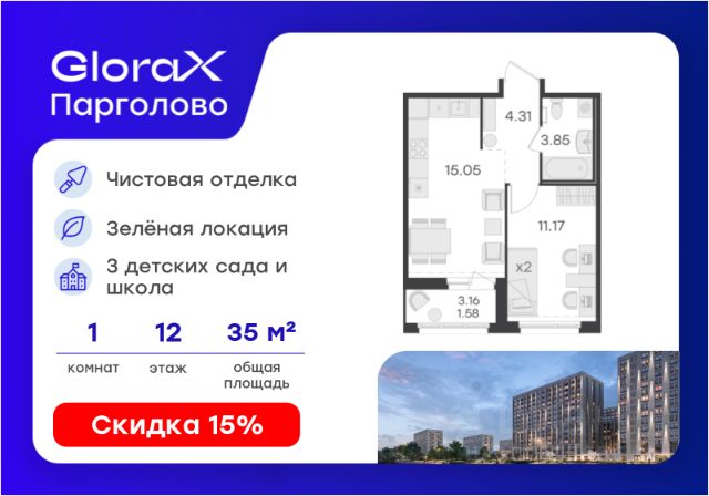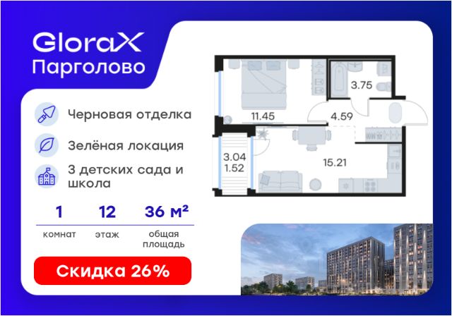 Продается 1-комн. квартира на 12-м этаже в проекте комфорт-класса GloraX Парголово. Общая площадь лота составляет 37,53 кв. м, из которых 10,82 кв. м отведено под жилую и 14,62 кв. м под кухонную зону. Номер квартиры - 105. Преимущества: - Квартира комфорт-класса - Зеленый район, Шуваловский парк в 20 мин. пешком - 10 мин. до КАД, 15 мин. до ЗСД - 5 эт. паркинг на 451 м/м - Закрытые дворы с видеонаблюдением - Детские площадки с геопласткой и бизиборадми - Сады и школы в шаговой доступности - Спортивные площадки и велодорожки - Собственный комьюнити-центр - Келлеры для хранения - Коммерческие помещения на 1 этажах GloraX Парголово — масштабный проект комфорт-класса в Выборгском районе Санкт-Петербурга. Место, продуманное до мелочей, где все, что необходимо — рядом. Архитектурно-пространственное решение отличается лаконичностью и строгостью и придает проекту свой характер. Внутренние дворы закрыты от внешнего мира, создавая приватную территорию для жителей. Живите на природе, но с комфортом мегаполиса. Десять минут на велосипеде или полчаса пешком — и вы окажетесь в одном из культовых мест отдыха петербуржцев: Шуваловском парке, Орловском заказнике с их чистыми карьерами или на Суздальских озерах. До ж/д станции "Парголово" 7 минут на автомобиле, до метро Проспект Просвещения 25 минут, КАД 10 минут, ЗСД 15 минут. В шаговой доступности остановка общественного транспорта. В шаговой доступности — собственные школы и детские сады. Здесь все создано для максимального комфорта каждого жителя. Приватное пространство внутреннего двора с беседками с розетками для работы и отдыха, зеленый двор с уютным многоуровневым освещением, детскими эко-площадками и спортивными workout создает неповторимую атмосферу, заряжающую энергией на новые свершения. Квартиры сдаются без отделки. Цена указана при 100% оплате или стандартной ипотеке. Узнайте подробности в Отделе продаж.