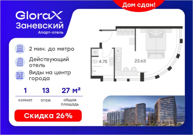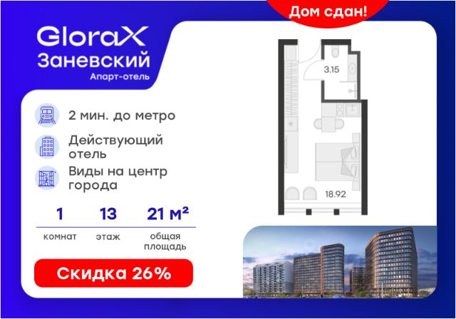 Продается апартамент-студия на 13-м этаже в сданном Апарт-комплексе бизнес-класса "GloraX Заневский". Ключи сразу! Общая площадь лота составляет 22,07 кв. м, из которых 18,92 кв. м отведено под жилую. Номер апартамента - 1 324. Преимущества: - Полная чистовая отделка - Возможность покупки меблировка и техника - Вход по ключ-карте - Прачечная на 1 этаже - Возможность дозаказа отельного сервиса - Программы доходности - Летний бар и променад - Воркаут площадка - Pet-friendly Апартаменты "GloraX Заневский" - проект бизнес-класса с развитой инфраструктурой, удовлетворяющей все потребности самых взыскательных гостей. Располагается в одном из наиболее перспективных, районов Петербурга в 2х минутах от метро "Ладожская" и в 10 минутах от Невского проспекта. В "GloraX Заневский" есть все, что необходимо для комфортной жизни, работы и отдыха. Инфраструктура, покрывающая все потребности и ожидания собственников и арендаторов. В радиусе 150 метров находятся супермаркеты с возможностью доставки продуктов прямо до дверей апартаментов. На 1000 кв. м. общественных пространств расположится уютный лобби-бар, ресторан мировой кухни на 80 человек и оборудованные коворкинги. В апартаментах "GloraX Заневский" выполнена современная отделка с использованием высококачественных экологичных материалов. В проекте предусмотрен подземный отапливаемый паркинг на 100 мест, куда можно спуститься на лифте прямо от дверей апартаментов. Узнайте подробности в Отделе продаж.