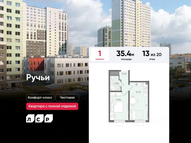 Цена действует при 100% оплате и на определенные ипотечные программы. Подробности — в отделе продаж по телефону. Продается 1-комнатная квартира в ЖК "Цветной город" на 13 этаже. Общая площадь составляет 31.70 кв. м. Квартира с чистовой отделкой Срок сдачи дома: 3 квартал 2026. Жилой комплекс "Цветной город" располагается по адресу Санкт-Петербург, Красногвардейский. "Цветной город" - современный масштабный эко-проект: жилые кварталы со своей сетью улиц, пешеходными бульварами и велодорожками, площадками для спорта и отдыха. Кварталы располагаются вдоль береговой линии реки Охты. "Цветной город" - это жизнь вблизи природы, но с городской пропиской. К 2026 году на берегах реки Охты будет создан Пейзажный парк с летними экотропами и зимними горками для тюбингов, скейт-парком и летним кинотеатром. В ЖК "Цветной город" запланировано и уже частично реализовано строительство 10 школ, 16 детских садов, 4 поликлиники, больница, ТРК, спортивно-оздоровительные сервисы С центром Петербурга жителей "Цветного города" свяжет Пискарёвский проспект, удобный выезд на КАД позволяет без труда добираться до других районов. Расположение: • 10 минут на авто до КАД; • 15 минут на авто до станций "Гражданский проспект" и "Академическая"; • 20 минут до ж/д станции "Ручьи".; Квартира сдается с готовой отделкой из современных экологичных материалов: на стенах плотные белые обои под покраску, на полу износостойкий матовый ламинат, в санузлах керамическая плитка на стенах и керамогранит на полу. Трубы отопления скрыты в стяжке пола и не мешают мебели. В квартире предусмотрено большое количество двойных розеток и выключателей. В ЖК "Цветной город" предусмотрена система "Умный дом": смартфон с приложением является ключом от всех дверей в ЖК, гостевой доступ оформляется в приложении, видеозвонки от домофона поступают в приложение, показания счетчиков автоматически передаются в учетные базы ЖКХ. Преимущества: • Рядом лесопарк и река Охта • Живописные виды из окон • Безбарьерная среда • Развитая социальная инфраструктура • Система "Умный дом" Успейте приобрести квартиру на выгодных условиях! Чтобы узнать подробности, обращайтесь за консультацией по телефону.