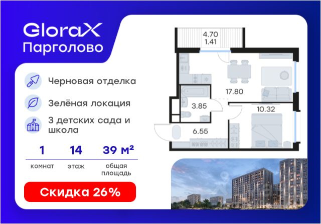 Продается 1-комн. квартира на 14-м этаже в проекте комфорт-класса GloraX Парголово. Общая площадь лота составляет 39,16 кв. м, из которых 12,54 кв. м отведено под жилую и 14,74 кв. м под кухонную зону. Номер квартиры - 269. Преимущества: - Квартира комфорт-класса - Зеленый район, Шуваловский парк в 20 мин. пешком - 10 мин. до КАД, 15 мин. до ЗСД - 5 эт. паркинг на 451 м/м - Закрытые дворы с видеонаблюдением - Детские площадки с геопласткой и бизиборадми - Сады и школы в шаговой доступности - Спортивные площадки и велодорожки - Собственный комьюнити-центр - Келлеры для хранения - Коммерческие помещения на 1 этажах GloraX Парголово — масштабный проект комфорт-класса в Выборгском районе Санкт-Петербурга. Место, продуманное до мелочей, где все, что необходимо — рядом. Архитектурно-пространственное решение отличается лаконичностью и строгостью и придает проекту свой характер. Внутренние дворы закрыты от внешнего мира, создавая приватную территорию для жителей. Живите на природе, но с комфортом мегаполиса. Десять минут на велосипеде или полчаса пешком — и вы окажетесь в одном из культовых мест отдыха петербуржцев: Шуваловском парке, Орловском заказнике с их чистыми карьерами или на Суздальских озерах. До ж/д станции "Парголово" 7 минут на автомобиле, до метро Проспект Просвещения 25 минут, КАД 10 минут, ЗСД 15 минут. В шаговой доступности остановка общественного транспорта. В шаговой доступности — собственные школы и детские сады. Здесь все создано для максимального комфорта каждого жителя. Приватное пространство внутреннего двора с беседками с розетками для работы и отдыха, зеленый двор с уютным многоуровневым освещением, детскими эко-площадками и спортивными workout создает неповторимую атмосферу, заряжающую энергией на новые свершения. Квартиры сдаются без отделки. Цена указана при 100% оплате или стандартной ипотеке. Узнайте подробности в Отделе продаж.