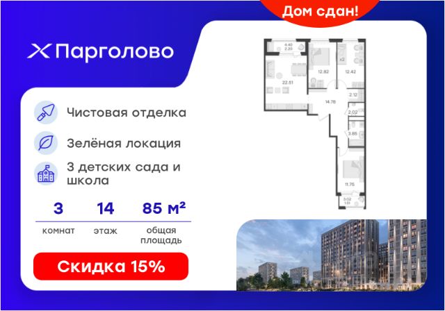 Дом сдан. Ключи сразу. Ипотека с господдержкой. Уютная четырехкомнатная квартира в жилом комплексе "Прагма City", который находится в Выборгском районе, который по праву считают самым экологичным в Санкт-Петербурге. Общая площадь 110.4 кв.м, жилая площадь 67.4 кв.м. Комнаты, выходящие окнами во двор, объединены большим балконом. Из помещений кухни и гостиной открывается вид на Шуваловский парк. Две комнаты освещены с двух сторон. Квартира прекрасно подходит для жизни семьи с детьми много комнат, просторный коридор, два санузла, высокий уровень шумоизоляции. ЖК "Прагма City" предлагает своим будущим жильцам проживание в домах, выполненных по монолитной технологии с гарантийным сроком службы 150 лет. Закрытая охраняемая территория и дворы, наличие консьержа и видеонаблюдения делают проживание безопасным. Родители могут безбоязненно отпускать детей для прогулок на оборудованных детских и спортивных площадках. Благодаря технологии строительства, грамотного проектированию, а также установки двойных стеклопакетов, остекленных балконов и лоджий, дом имеет высокий класс энергоэффективности "А". Жилой комплекс "Прагма city" расположен в зелёном районе Санкт-Петербурга. Окна одного из фасадов комплекса выходят на Шуваловский парк, это прекрасное место для прогулок с детьми, домашними животными или для занятий спортом. Вокруг развитая инфраструктура школы, детские сады, развлекательные центры, медицинские учреждения здесь есть все для вашего комфортного проживания. ЖК "Прагма city" имеет удобное расположение: 15 минут пешком до метро, 5 минут на автомобиле до КАД, торговый центр "МЕГА Парнас" находится рядом. Это универсальный район, ведь он предназначен как для семей с детьми, так и для тех, кто привык к активному образу жизни.