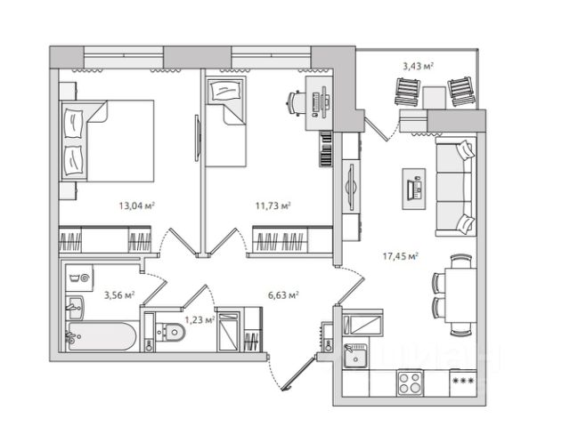 При входе есть место под глубоктй шкаф купе-60 см, болшая совмещенная ванная с туалетом, где поместиться стиральная машинка, к комнате-гостинной отделена зона, для кухни. В квартире есть 2-е колонны, как раз в зоне приготовления пищи, там прекрасно рисуется дизайн-проект со столом(типа барной стойки), так же сверху можно разместить полку, для бокалов, микроволновки или так же продолжить систему кухонного хранения. как раз получается отдельный островок. Остальная часть под огромный диван, телевизор или просто фитнес зал, кто что хочет. Очень получается уютно. Окна смотрят во двор, вдали от проезжей части, никогда не будет шума.