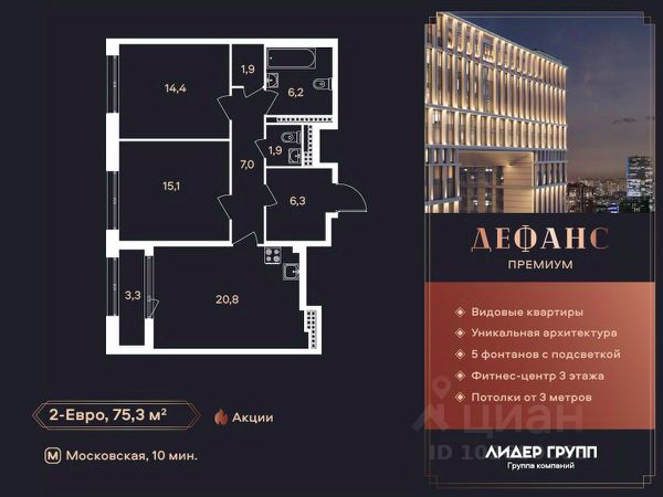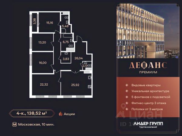 ЖК "Дефанс Премиум". Строительство завершено. Дом получил заключение о соответствии и готовится к вводу! Это проект авторской архитектуры с уникальными форматами квартир в 10 минутах ходьбы от станции метро "Московская". Дом выполнен в виде двух 23-х этажных арок, основания которых объединены единым внутренним пространством с большой парадной лестницей, променадом и большим фонтанным комплексом с подсветкой. В составе проекта построен большой фитнес-центр с бассейнами и зоной СПА. Часть квартир отделена от остальных жилых этажей специальным техническим этажом — это снимает все ограничения по перепланировке. Для части квартир предусмотрены индивидуальные входные группы и дополнительные лифты премиального немецкого бренда Tyssen Krupp (TKE). Фасады, облицованные испанской керамикой и алюминиевые панорамные окна с энергоэффективными стеклами AGС Energy подчеркивают высокий статус дома. На квартиры ЗПИФ и переуступки семейная ипотека не распространяется!