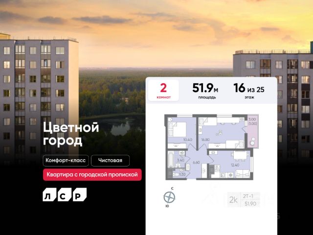 Цена действует при 100% оплате и на определенные ипотечные программы. Подробности — в отделе продаж по телефону. Продается 1-комнатная квартира в ЖК "Цветной город" на 16 этаже. Общая площадь составляет 32.40 кв. м. Квартира с чистовой отделкой Срок сдачи дома: 3 квартал 2026. Жилой комплекс "Цветной город" располагается по адресу Санкт-Петербург, Красногвардейский. "Цветной город" - современный масштабный эко-проект: жилые кварталы со своей сетью улиц, пешеходными бульварами и велодорожками, площадками для спорта и отдыха. Кварталы располагаются вдоль береговой линии реки Охты. "Цветной город" - это жизнь вблизи природы, но с городской пропиской. К 2026 году на берегах реки Охты будет создан Пейзажный парк с летними экотропами и зимними горками для тюбингов, скейт-парком и летним кинотеатром. В ЖК "Цветной город" запланировано и уже частично реализовано строительство 10 школ, 16 детских садов, 4 поликлиники, больница, ТРК, спортивно-оздоровительные сервисы С центром Петербурга жителей "Цветного города" свяжет Пискарёвский проспект, удобный выезд на КАД позволяет без труда добираться до других районов. Расположение: • 10 минут на авто до КАД; • 15 минут на авто до станций "Гражданский проспект" и "Академическая"; • 20 минут до ж/д станции "Ручьи".; Квартира сдается с готовой отделкой из современных экологичных материалов: на стенах плотные белые обои под покраску, на полу износостойкий матовый ламинат, в санузлах керамическая плитка на стенах и керамогранит на полу. Трубы отопления скрыты в стяжке пола и не мешают мебели. В квартире предусмотрено большое количество двойных розеток и выключателей. В ЖК "Цветной город" предусмотрена система "Умный дом": смартфон с приложением является ключом от всех дверей в ЖК, гостевой доступ оформляется в приложении, видеозвонки от домофона поступают в приложение, показания счетчиков автоматически передаются в учетные базы ЖКХ. Преимущества: • Рядом лесопарк и река Охта • Живописные виды из окон • Безбарьерная среда • Развитая социальная инфраструктура • Система "Умный дом" Успейте приобрести квартиру на выгодных условиях! Чтобы узнать подробности, обращайтесь за консультацией по телефону.