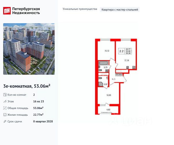 Продается уютная 2-комнатная квартира от застройщика в жилом комплексе "Город звезд" в новом городе на правом берегу Невы. До метро можно добраться на транспорте всего за 13 минут. Мастер-спальня с собственной ванной комнатой. Самое приватное пространство в вашей квартире. Уникальная, функциональная европланировка, большая кухня-гостиная 17.34 м², вместительная прихожая 7 м². Общая площадь квартиры - 55.45 м², жилая 24.08 м², высота потолка 2.77 м. Квартира продается с отделкой "Норд Лайн серый". Что особенного в ЖК "Город звезд"? • Инновационный Лицей Setl с оригинальной архитектурной концепцией и уникальной образовательной средой • Четыре тематические площади отдыха с разнообразным благоустройством • Аллея Звёзд - променад протяженностью 5 км с ландшафтным озеленением, зонами отдыха и велодорожкой • Выход на набережную реки Утки, где можно порыбачить или взять напрокат лодку • Единая входная группа с ресепшен и подземный паркинг • Невский лесопарк под окнами - всегда свежий воздух и полноценный отдых на природе