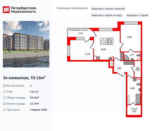 В центре Петербурга на берегу реки Охты представлена 2-х комнатная квартира на 2 этаже общей площадью 54.64 кв.м. Дом бизнес-класса в креативном центре Петербурга на берегу реки Охты и 25 минутах пешком до Невского проспекта и 17 минутах пешком до м. Новочеркасская. Неповторимая и цельная атмосфера места. Река, которая обнимает дома, дышащие фасады из натуральных материалов, парк с родниками и травами во дворе и уникальная пластичная архитектура созвучны характеру современного города. АЛЬПЕН - дом твоего равновесия. - Приватные корпуса; - Выразительные фасадные решения; - Декоративная подсветка фасада; - Панорамные террасы с видом на реку Охта; - Квартиры с верандами формата high flat; - Витринное остекление. Внутренний двор, набережная и прилегающие территории образуют цельную эко среду, идеальную для комфортной, насыщенной новыми впечатлениями и эмоциями, динамичной жизни. Авторский двор-парк, переходящий в набережную - живописное природное окружение с тропами, променадом и увлекательными маршрутами для путешествий. Холлы и общественные пространства - продолжение парка. Авторское прочтение общественного пространства от московского дизайн бюро STUDIO 211 с первых минут позволяет ощутить ценность равновесия. АЛЬПЕН - для тех, кто ценит близость центра, уединенность и природную энергетику. - Семейная ипотека 4,3% на весь период кредитования. Ипотека предоставляется Сбербанком. Сумма кредита до 12 млн рублей, первый взнос от 20,1%. - Рассрочка на 2/6/12 месяцев.