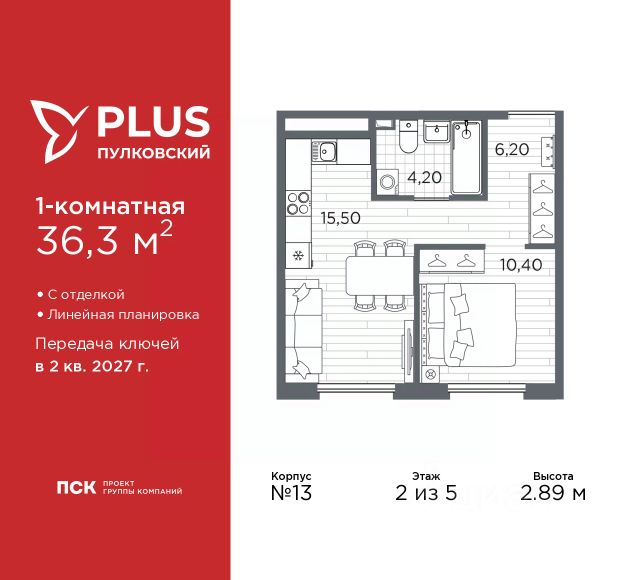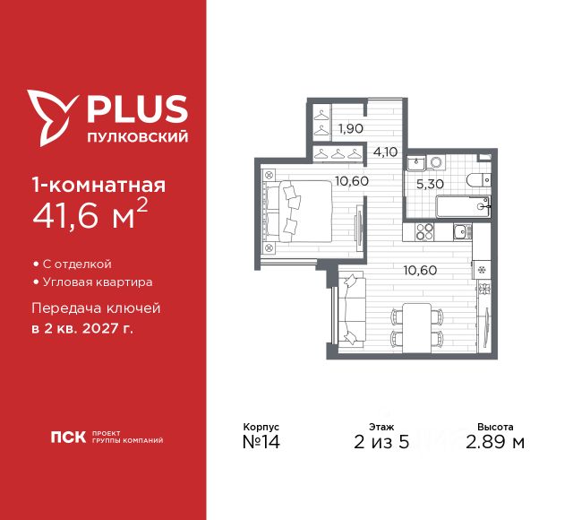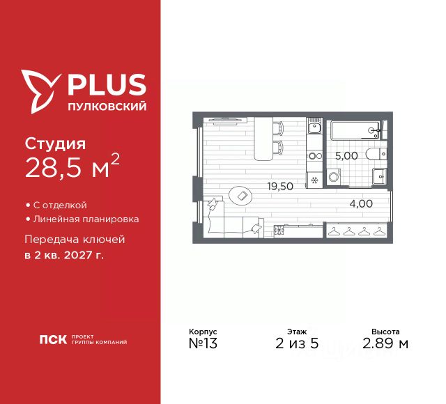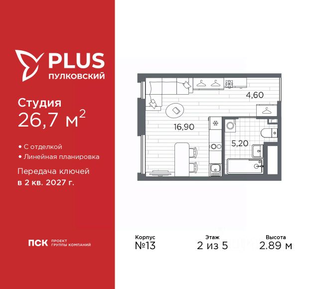 Продается 1-комн. квартира-студия от застройщика с отделкой в ЖК "PLUS Пулковский" на 2 этаже. Общая площадь: 21.6 кв.м., площадь гостиной 12.9 кв.м., из которых 5 кв.м. выделено под кухонную зону. Все окна выходят на одну сторону. В квартире один совмещенный санузел. Высота потолков 2.89 м. Дом монолитный, трехподъездный, высотой 5 этажей. Квартира находится в 1-й секции в корпусе 14. На этаже 6 квартир. В подъезде 1 грузовой лифт. Начало строительства - 1 квартал 2026 года. Окончание строительства - 2 квартал 2027 года. Оформление сделки по договору долевого участия. ЖК "PLUS Пулковский" расположен в престижном Московском районе на пересечении Пулковского и Волхонского шоссе, по которым можно быстро добраться до КАД и до станций метро Московская и Звёздная. Поблизости расположены дворцово-парковые ансамбли Пушкина, Павловска, Петергофа, Гатчины, Ломоносова, а также вся торговая и развлекательная инфраструктура: ТК Лето, Outlet Village Pulkovo, Пулково-3, гипермаркеты Лента, Окей, Metro. На территории комплекса будут построены средняя образовательная школа на 825 мест с двумя бассейнами, 2 детских сада на 220 мест каждый. В детских садах тоже будут бассейны. Кроме этого будет построен медицинский центр для взрослых и детей. Во дворах буду оборудованы спортивные и безопасные детские площадки, на первых этажах домов будут расположены коммерческие помещения. Для автолюбителей будут подземные и наземный паркинги. Для жителей домов будет доступно "приложение жителя", которое предоставит такие возможности: — дистанционное открытие дверей в парадную и на территорию комплекса, — просмотр изображений с видеокамер, — контроль за показаниями счетчиков, — коммуникация с УК. Показания всех счетчиков будут собираться дистанционно. В квартирах будет выполнена коллекторная разводка отопления в стяжке пола от коллекторов в межквартирных коридорах. Застройщик ЖК "PLUS Пулковский" - группа компаний ПСК, которая является одной из ведущих девелоперских компаний Санкт Петербурга. Более 16 лет она возводит в Северной столице качественное жилье премиум, бизнес и комфорт-класса, социальные объекты школы и детские сады, апарт-комплексы и торговые центры и является четырехкратным обладателем золотого знака "Надежный застройщик России". #zmFU2C