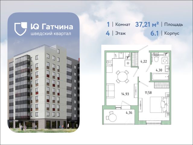 IQ Гатчина- жилой квартал комфорт -класса, в историческом пригороде Санкт-Петербурга городе Гатчина. Концепцию создания комплекса разрабатывало шведское архитектурное бюро Йоханнеса Товатта с европейским подходом к каждой детали. Транспортная доступность: 20 мин. на авто до КАД, 30 мин. до метро "Московская" и не больше часа до центра Санкт-Петербурга. В шаговой доступности от комплекса парки Гатчинского дворца, остановки общественного транспорта, а также ж/д станция "Татьянино". О проекте: комплекс имеет переменную высотность от 5-12 этажей, яркие фасады и безбарьерную среду. Места общего пользования выполнены по дизайн проекту, с современными бесшумными лифтами, колясочными и витражным остеклением. Комнаты правильной квадратной формы, увеличенные окна с двойными стеклопакетами, высота потолков от 2,7 м2 до 3,02 м2 на последних этажах. Инфраструктура: на первых этажах предусмотрены коммерческие помещения, в сданных домах уже работают супермаркеты, аптеки, салоны красоты и уютные кафе, прямо напротив жилого комплекса - крупный ТЦ. В квартале уже открыла свои двери современная школа на 825 мест и детский сад на 120 мест, а также в ближайшее время запланировано строительство второго детского сада. Благоустройство: квартал полностью имеет закрытые дворы, в которых каждый почувствует себя максимально безопасно, работает круглосуточное видеонаблюдение, доступ только для жителей и их гостей по системе IP домофония, концепция "дворы без машин", зеленые аллеи, ландшафтное озеленение, современные игровые комплексы, спортивные площадки. Для владельцев животных предусмотрены лапамойки. Уникальный образовательный кластер: Гатчинский государственный университет (ГГУ), Государственный институт экономики, финансов, права и технологий, "Гатчинский педагогический колледж имени К.Д. Ушинского", ЧОУ "Первая академическая гимназия г. Гатчина", МБОУ СОШ No12 "Центр образования", Детские сады No26 и No52 Первый дома комплекса уже сданы и заселены. В комплексе так же работает "Живи клуб", который объединяет жителей общими идеями и хобби. Отделка: в строящихся домах можно заказать чистовую отделку на своему вкус, либо выбрать отделку в стиле "Скандинавия" или "Дерево". Купить квартиру на 4 этаже в Гатчине.