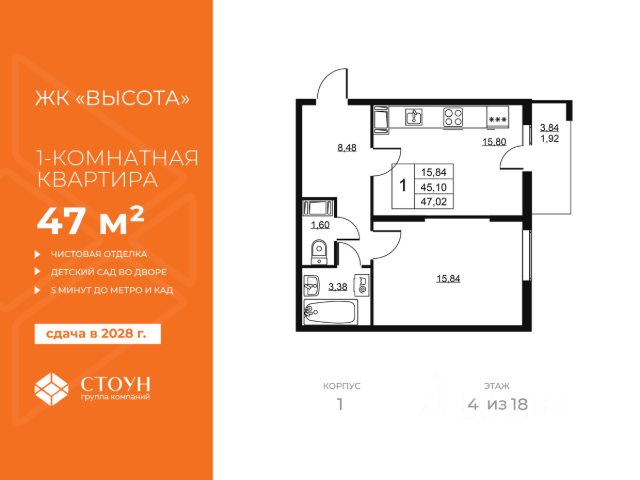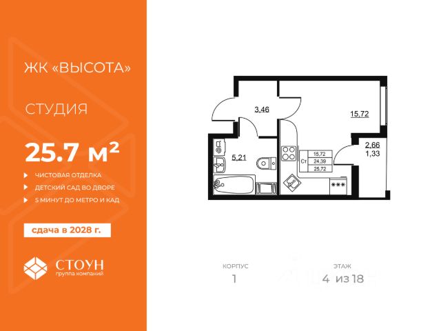 Cрок сдачи - 4 кв 2028 Продается двухкомнатная квартира в жилом комплексе "Высота" от ГК СТОУН нa 4 этаже. Общaя площадь cоcтaвляeт 78.47 кв. м. Квартира отделка fine. Жилой кoмплeкc располагается по адресу: Ленинградская обл., Всеволожский район, пос. Бугры, Гаражный проезд, ул. Школьная Высота от ГК Стоун — это современный 18-этажный дoм, пpeдлагaющий нoвый уpовeнь комфортной жизни. Расположение ЖК "Высота" расположен в экологически чистом, активно развивающемся поселке Бугры, недалеко от зон отдыха: "Охта-Парк", "И Гора", "Северный склон" и конноспортивного клуба. Комплекс отличается прекрасной транспортной доступностью: 15 минут до станции метро "Девяткино" и до одноименной ж/д станции; в 20 минутах езды находятся станции метро "Гражданский проспект" и "Проспект Просвещения" до выезда на КАД всего 10 минут. Комплекс состоит из одного дома, разделенного на 7 секций. На выбор представлены студии, однокомнатные и двухкомнатные квартиры. Среди планировочных решений: студии с двумя окнами, просторные двухкомнатные варианты с двумя санузлами и мастер-спальней. Все квартиры сдаются с готовой чистовой отделкой. Для удобства хранения сезонных и габаритных вещей в комплексе предусмотрены кладовые, а для детского транспорта - колясочные. Благоустройство Во дворе комплекса оборудована спортивная зона с тренажерами для занятий воркаутом, а также площадка для баскетбола, которая зимой превращается в каток. Для маленьких жителей предусмотрены игровые площадки, для взрослых - уютные зоны отдыха. На территории будут высажены деревья и пышные кустарники. Удобство добавляют велопарковки, расположенные у парадных и во дворе, а также отдельные входы на автостоянки. Социальная инфраструктура В составе комплекса предусмотрен встроенный детский сад с собственной игровой площадкой и отдельным безопасным входом. Дошкольное учреждение рассчитано на 75 мест. Ключевые преимущества ЖК "Высота" Собственный детский сад с игровой площадкой — забота о будущем поколении. Близость к метро — экономия времени и сил. Развитая инфраструктура — всё необходимое под рукой. Каток и баскетбольное площадка — здоровье и активный образ жизни. Большой выбор планировок — квартира вашей мечты. Полная чистовая отделка в подарок — заезжай и живи! Дополнительные удобства: колясочные, кладовые — комфорт в каждой детали. Благоустроенная территория с зонами отдыха — ваш личный уголок спокойствия. Безбарьерная среда— забота о каждом.