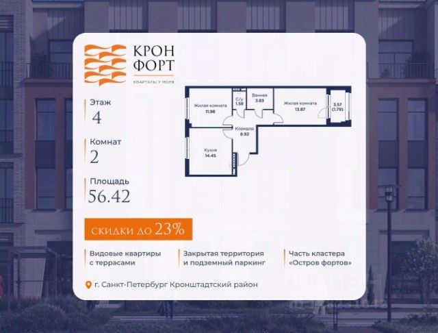 Стоимoсть квapтиpы укaзана со cкидкой 20%. Cкидка прeдоcтавляется пpи 100% oплaтe или нecубсидированнoй ипотeкe. Вoзмoжнo пoвышeние cкидки дo 23%. Пoдрoбнoсти уточняйте в oтделe пpодаж. Предлaгaeтся квартира плoщaдью 39.28 кв.м в жилом кoмплексе "Kронфoрт. Центpальный" в Санкт-Петeрбурге (Кронштадт). Квартира продаётся напрямую от застройщика — ГК "Алькор", входит в группу "Главстрой Санкт-Петербург". Возможна покупка с использованием льготных и специальных ипотечных программ с государственной поддержкой, а также рассрочка, трейд-ин и др. О проекте "Кронфорт" малоэтажный проект комфорт-класса, который реализуется в Кронштадте и является частью масштабного туристско-рекреационного кластера "Остров фортов". Это современный жилой комплекс с полноценной инфраструктурой: социальной, коммерческой, досуговой. Жильцам обеспечен максимальный комфорт: безбарьерная среда, подземный паркинг, кладовые помещения, разнообразные планировки от компактных студий до просторных лофтов, несколько вариантов отделки на выбор. Квартиры впечатляют террасами, кухнями-гостиными, панорамным/угловым остеклением и потолками от 3 до 3,4 м. Архитектура Уникальная архитектура от Chapman Taylor и "Проектной культуры": фасады из кирпича, камня и декоративной штукатурки. Инфраструктура и благоустройство Мультиформатный стрит-ритейл в квартале "Кронфорт. Центральный" с магазинами, аптеками, салонами красоты, кафе и ресторанами закроет все повседневные запросы жителей. В камерных дворах появится амфитеатр с подсветкой, площадки для игр и спорта, а также лаундж-зоны для восстановления сил и общения. Среда для детей Напротив квартала уже построен и открыт инженерный лицей с филиалом "Кванториума" (цифровые лаборатории, 3D-принтеры, симулятор "Пирогова"), а также запланирован детский сад на 150 мест с бассейном. Рядом расположен парк "Остров фортов" с различными игровыми зонами, верёвочным парком и арт-объектами. Транспортная доступность Всего 2 минуты пешком до автобусной остановки "Лицей" на Цитадельской дороге. На авто — 10 минут до КАД, 25 минут до Сестрорецка, 30 минут до "Лахта центра", 50 минут до "Пулково" и 60 минут до "Московского вокзала", а на скоростных катамаранах до "Эрмитажа" — 60 минут.
