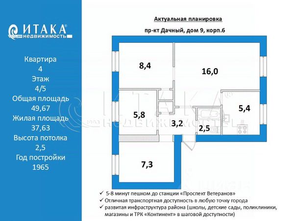 Хорошая транспортная доступность: Всего 10 минут пешком до станции метро "Проспект Ветеранов" — для Санкт-Петербурга это огромное преимущество, экономия времени на дорогу каждый день. Хорошее транспортное сообщение, благодаря которому вы сможете доехать в любую точку города и до главных культурных достопримечательностей.