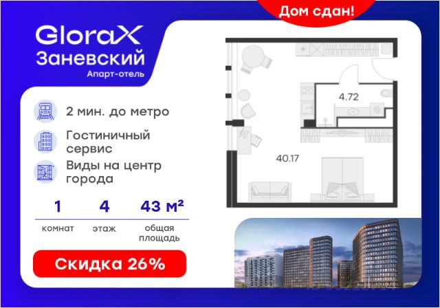 Продается 2-комн. апартамент на 4-м этаже в сданном Апарт-комплексе бизнес-класса "GloraX Заневский". Ключи сразу! Общая площадь лота составляет 79,85 кв. м, из которых 28,94 кв. м отведено под жилую. Номер апартамента - 413. Преимущества: - Полная чистовая отделка - Возможность покупки меблировка и техника - Вход по ключ-карте - Прачечная на 1 этаже - Возможность дозаказа отельного сервиса - Программы доходности - Летний бар и променад - Воркаут площадка - Pet-friendly Апартаменты "GloraX Заневский" - проект бизнес-класса с развитой инфраструктурой, удовлетворяющей все потребности самых взыскательных гостей. Располагается в одном из наиболее перспективных, районов Петербурга в 2х минутах от метро "Ладожская" и в 10 минутах от Невского проспекта. В "GloraX Заневский" есть все, что необходимо для комфортной жизни, работы и отдыха. Инфраструктура, покрывающая все потребности и ожидания собственников и арендаторов. В радиусе 150 метров находятся супермаркеты с возможностью доставки продуктов прямо до дверей апартаментов. На 1000 кв. м. общественных пространств расположится уютный лобби-бар, ресторан мировой кухни на 80 человек и оборудованные коворкинги. В апартаментах "GloraX Заневский" выполнена современная отделка с использованием высококачественных экологичных материалов. В проекте предусмотрен подземный отапливаемый паркинг на 100 мест, куда можно спуститься на лифте прямо от дверей апартаментов. Узнайте подробности в Отделе продаж.