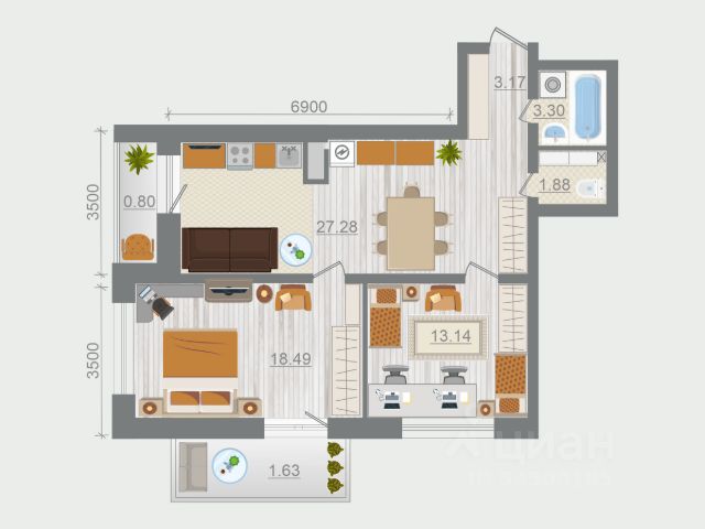 Продаётся 2-комнатная квартира в строящемся доме (Корпус 1.2), срок сдачи: II-кв. 2026, общей площадью 69.69 кв.м., на 5 этаже.