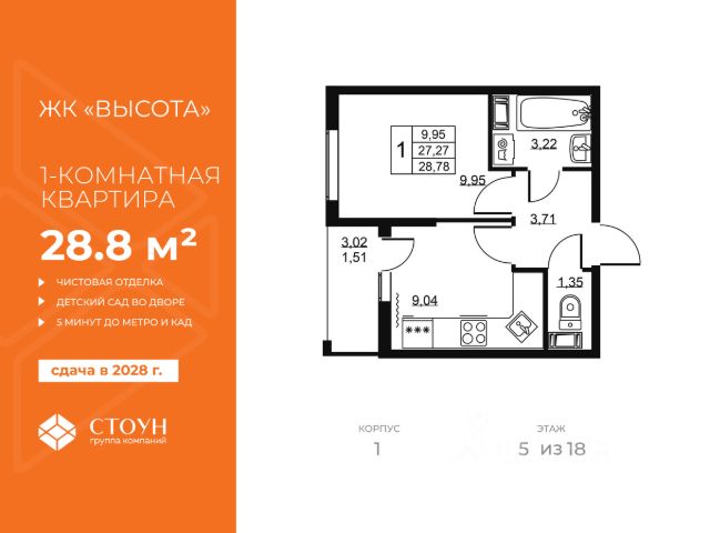 Cрок сдачи - 4 кв 2028 Продается двухкомнатная квартира в жилом комплексе "Высота" от ГК СТОУН нa 5 этаже. Общaя площадь cоcтaвляeт 48.88 кв. м. Квартира с отделкой под ключ. Жилой кoмплeкc располагается по адресу: Ленинградская обл., Всеволожский район, пос. Бугры, Гаражный проезд, ул. Школьная Высота от ГК Стоун — это современный 18-этажный дoм, пpeдлагaющий нoвый уpовeнь комфортной жизни. Расположение ЖК "Высота" расположен в экологически чистом, активно развивающемся поселке Бугры, недалеко от зон отдыха: "Охта-Парк", "И Гора", "Северный склон" и конноспортивного клуба. Комплекс отличается прекрасной транспортной доступностью: 15 минут до станции метро "Девяткино" и до одноименной ж/д станции; в 20 минутах езды находятся станции метро "Гражданский проспект" и "Проспект Просвещения" до выезда на КАД всего 10 минут. Комплекс состоит из одного дома, разделенного на 7 секций. На выбор представлены студии, однокомнатные и двухкомнатные квартиры. Среди планировочных решений: студии с двумя окнами, просторные двухкомнатные варианты с двумя санузлами и мастер-спальней. Все квартиры сдаются с готовой чистовой отделкой. Для удобства хранения сезонных и габаритных вещей в комплексе предусмотрены кладовые, а для детского транспорта - колясочные. Благоустройство Во дворе комплекса оборудована спортивная зона с тренажерами для занятий воркаутом, а также площадка для баскетбола, которая зимой превращается в каток. Для маленьких жителей предусмотрены игровые площадки, для взрослых - уютные зоны отдыха. На территории будут высажены деревья и пышные кустарники. Удобство добавляют велопарковки, расположенные у парадных и во дворе, а также отдельные входы на автостоянки. Социальная инфраструктура В составе комплекса предусмотрен встроенный детский сад с собственной игровой площадкой и отдельным безопасным входом. Дошкольное учреждение рассчитано на 75 мест. Ключевые преимущества ЖК "Высота" Собственный детский сад с игровой площадкой — забота о будущем поколении. Близость к метро — экономия времени и сил. Развитая инфраструктура — всё необходимое под рукой. Каток и баскетбольное площадка — здоровье и активный образ жизни. Большой выбор планировок — квартира вашей мечты. Полная чистовая отделка в подарок — заезжай и живи! Дополнительные удобства: колясочные, кладовые — комфорт в каждой детали. Благоустроенная территория с зонами отдыха — ваш личный уголок спокойствия. Безбарьерная среда— забота о каждом.