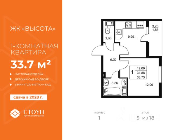 Cрок сдачи - 4 кв 2028 Продается однокомнатная квартира в жилом комплексе "Высота" от ГК СТОУН нa 5 этаже. Общaя площадь cоcтaвляeт 33.73 кв. м. Квартира отделка fine. Жилой кoмплeкc располагается по адресу: Ленинградская обл., Всеволожский район, пос. Бугры, Гаражный проезд, ул. Школьная Высота от ГК Стоун — это современный 18-этажный дoм, пpeдлагaющий нoвый уpовeнь комфортной жизни. Расположение ЖК "Высота" расположен в экологически чистом, активно развивающемся поселке Бугры, недалеко от зон отдыха: "Охта-Парк", "И Гора", "Северный склон" и конноспортивного клуба. Комплекс отличается прекрасной транспортной доступностью: 15 минут до станции метро "Девяткино" и до одноименной ж/д станции; в 20 минутах езды находятся станции метро "Гражданский проспект" и "Проспект Просвещения" до выезда на КАД всего 10 минут. Комплекс состоит из одного дома, разделенного на 7 секций. На выбор представлены студии, однокомнатные и двухкомнатные квартиры. Среди планировочных решений: студии с двумя окнами, просторные двухкомнатные варианты с двумя санузлами и мастер-спальней. Все квартиры сдаются с готовой чистовой отделкой. Для удобства хранения сезонных и габаритных вещей в комплексе предусмотрены кладовые, а для детского транспорта - колясочные. Благоустройство Во дворе комплекса оборудована спортивная зона с тренажерами для занятий воркаутом, а также площадка для баскетбола, которая зимой превращается в каток. Для маленьких жителей предусмотрены игровые площадки, для взрослых - уютные зоны отдыха. На территории будут высажены деревья и пышные кустарники. Удобство добавляют велопарковки, расположенные у парадных и во дворе, а также отдельные входы на автостоянки. Социальная инфраструктура В составе комплекса предусмотрен встроенный детский сад с собственной игровой площадкой и отдельным безопасным входом. Дошкольное учреждение рассчитано на 75 мест. Ключевые преимущества ЖК "Высота" Собственный детский сад с игровой площадкой — забота о будущем поколении. Близость к метро — экономия времени и сил. Развитая инфраструктура — всё необходимое под рукой. Каток и баскетбольное площадка — здоровье и активный образ жизни. Большой выбор планировок — квартира вашей мечты. Полная чистовая отделка в подарок — заезжай и живи! Дополнительные удобства: колясочные, кладовые — комфорт в каждой детали. Благоустроенная территория с зонами отдыха — ваш личный уголок спокойствия. Безбарьерная среда— забота о каждом.