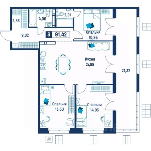 Продаётся 3-комнатная квартира в строящемся доме (Корпус 6), срок сдачи: III-кв. 2029, общей площадью 91.42 кв.м., на 5 этаже.
