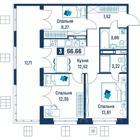 Продаётся 3-комнатная квартира в строящемся доме (Корпус 6), срок сдачи: III-кв. 2029, общей площадью 66.66 кв.м., на 5 этаже.