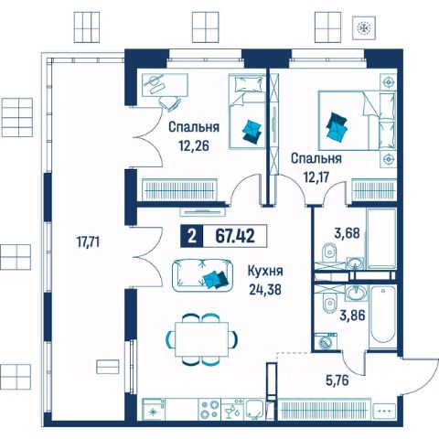 Продаётся 2-комнатная квартира в строящемся доме (Корпус 6), срок сдачи: III-кв. 2029, общей площадью 67.42 кв.м., на 5 этаже.