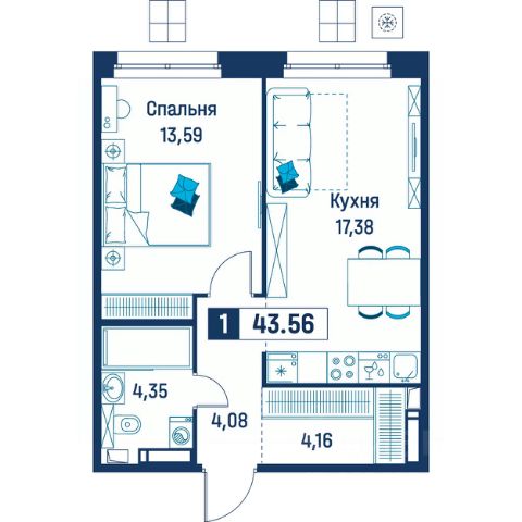 Продаётся 1-комнатная квартира в строящемся доме (Корпус 6), срок сдачи: III-кв. 2029, общей площадью 43.56 кв.м., на 5 этаже.