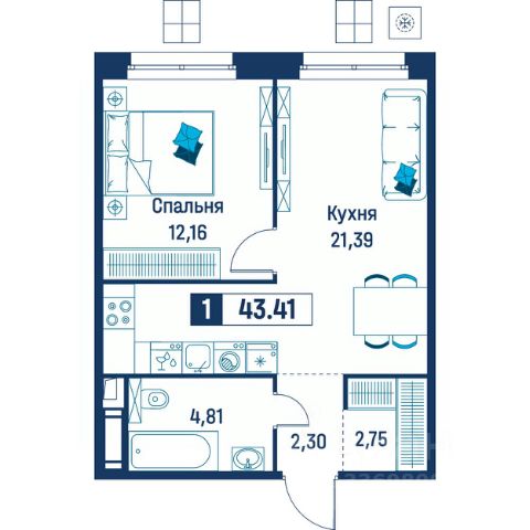 Продаётся 1-комнатная квартира в строящемся доме (Корпус 6), срок сдачи: III-кв. 2029, общей площадью 43.41 кв.м., на 5 этаже.