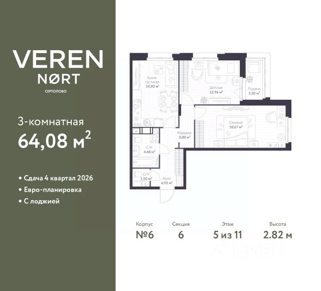 Успейте оформить бронирование по этой цене! Предложение ограничено! Стоимость квартиры указана со скидкой, ваша экономия составит 1,649,131 RUB. Информация по телефону, наши менеджеры вам все расскажут! Однокомнатная квартира от застройщика в Veren Nort Сертолово на 5 этаже. Квартира без отделки, полностью готова к ремонту. Общая площадь: 32.72 кв.м., жилая: 11.7 кв.м., площадь просторной куxни-гостиной: 11.14 кв.м. Все окна выходят на одну сторону. В квартире один балкон, один совмещенный санузел. Высота потолков 2.82 м. Квартира находится в корпусе 2. Дом монолитный, одноподъездный, высотой 11 этажей. На этаже 14 квартир. В подъезде 1 пассажирский и 1 грузовой лифт. Начало строительства - 3 квартал 2023 года. Окончание строительства - 4 квартал 2025 года. Оформление сделки по договору долевого участия. С балконом, с гардеробом, вид на приватный двор. Сочетание современной архитектуры и отличной экологии севера Лен. области. Выразительный облик домов разработан именитым архитектурным бюро "Остоженка". Характеристики жилого комплекса исключительны: продуманный ландшафтный дизайн, оригинальные парадные, разработанные по индивидуальному дизайн-проекту, современные детские и многофункциональные спортивные площадки, летний кинотеатр под открытым небом, два детских сада. Комплекс создается в уже сложившейся инфраструктуре г. Сертолово и обладает удобным транспортным сообщением с Санкт-Петербургом. В 300 метрах от "VEREN NORT сертолово" планируется транспортно-пересадочный узел "Сертолово", который обеспечит удобную железнодорожную связь с Финляндским вокзалом Санкт-Петербурга. #ZU4cMb Купить квартиру на 5 этаже в Сертолово.