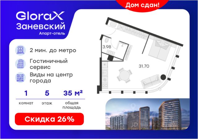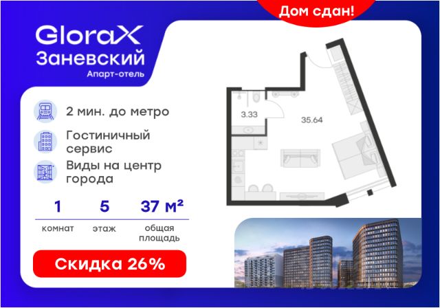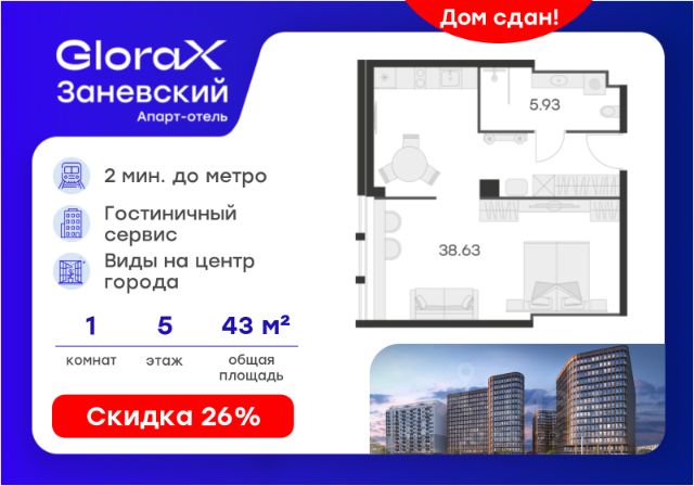 Продается 1-комн. апартамент на 5-м этаже в Апарт-отеле "GloraX Заневский" с сервисом 4*. Старт работы отеля - декабрь 2024 г.! Общая площадь лота составляет 44,56 кв. м, из которых 38,63 кв. м отведено под жилую. Номер апартамента - 509. Преимущества: - Апарт-отель с сервисом 4 звезды - Меблировка и техника - 2 вида доходных программ - Консьерж-сервис - Вход по ключ-карте - Прачечная для гостей на 1 этаже - Уборка номеров - Безопасная территория и изолированный внутренний двор - Pet-friendly Апарт-отель "GloraX Заневский" современный отель с развитой инфраструктурой, удовлетворяющей все потребности самых взыскательных гостей. Апарт-отель "GloraX Заневский" располагается в одном из наиболее перспективных, районов Петербурга в 2х минутах от метро "Ладожская" и Ладожского вокзала, в 10 минутах от Московского вокзала и в 20 минутах от исторического центра. В апарт-отеле "GloraX Заневский" есть все, что необходимо для комфортной жизни, работы и отдыха. Инфраструктура, покрывающая все потребности и ожидания собственников и арендаторов. В радиусе 150 метров находятся супермаркеты с возможностью доставки продуктов прямо до дверей апартаментов. На 1000 кв. м. общественных пространств расположится уютный лобби-бар, ресторан мировой кухни на 80 человек, фитнес-зал и оборудованные коворкинги. В апартаментах "GloraX Заневский" выполнена современная отделка с использованием высококачественных экологичных материалов. Инновационные технологические системы, аварийные и противопожарные датчики, взаимодействие со службами быстрого реагирования гарантируют резидентам комплексную безопасность. В проекте предусмотрен подземный отапливаемый паркинг на 100 мест, куда можно спуститься на лифте прямо от дверей апартаментов. Вся информация по эксплуатации номера аккумулируется в специально разработанном приложении, не имеющем аналогов на рынке. Функциональное и удобное приложение помогает оперативно решать все возникающие вопросы в режиме реального времени. Благодаря инновационному решению по оперативным выплатам деньги от аренды поступят на ваш счет максимально быстро. Цена указана при 100% оплате или стандартной ипотеке. Узнайте подробности в Отделе продаж.