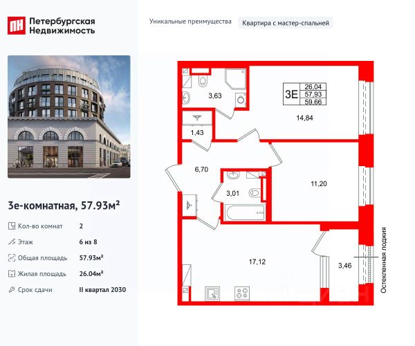 Окна выходят на две стороны: две комнаты с панорамным остеклением — в сторону Невы и ЖК Империал, кухня-гостиная — в тихий благоустроенный двор.