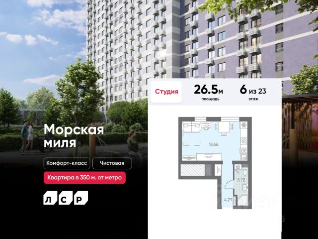 Цена действует при 100% оплате и на определенные ипотечные программы. Подробности — в отделе продаж по телефону. Продается студия в ЖК "Морская миля" на 6 этаже. Общая площадь составляет 21.43 кв. м. Квартира с чистовой отделкой. Жилой комплекс "Морская миля" располагается по адресу Санкт-Петербург, Красносельский. Морская миля - жилой комплекс в Красносельском районе Санкт-Петербурга. Расположение комплекса - его главное преимущество: близость к таким историческим памятникам и местам, как Петергоф, Павловский дворец и Царское село позволяет в любой момент насладиться красотами культурной столицы России. Расположение: - всего 350 м до новой станции метро "Юго-Западная"; - 20 минут до Петергофа на автомобиле; - 20 минут до аэропорта "Пулково" на автомобиле; - 30 минут до Царского села на автомобиле. Между корпусами расположены спортивные и детские площадки, пешеходный бульвар. В квартире выполнена полная отделка "Comfort Wood" из качественных материалов: прочный ламинат цвета благородного дуба, фактурные белые обои, керамическая плитка в ванной. Вход в парадные расположен на уровне земли и создает доступную среду для пожилых людей, людей с ограниченными возможностями и мам с колясками. На этажах и в подвале есть кладовые, которые позволят освободить пространство квартиры от лишних вещей. Первые этажи отведены под магазины и колясочные. На территории комплекса находятся наземные паркинги, гостевые парковки, детский сад, школа. В пешей доступности расположены магазины, кафе, аптеки и прочие удобства, необходимые для спокойной и комфортной жизни. Во дворах устроены пешеходные зоны, дворы озеленены и благоустроены: имеются тенистые аллеи, уютные зоны для отдыха детей и взрослых, а также стильные плей-хабы. Преимущества: - Станция метро в пешей доступности - Пешеходный бульвар - Близость к памятникам культуры и архитектуры - Школа и детский сад во дворе - Доступная среда Успейте приобрести квартиру на выгодных условиях! Чтобы узнать подробности, обращайтесь за консультацией по телефону.