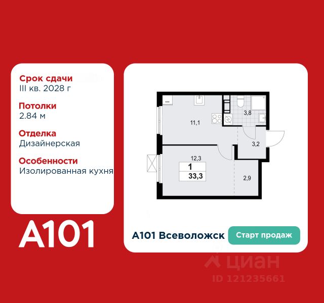 1-комнатная квартира площадью 33.20 в ЖК "А101 Всеволожск" c лоджией на 8 этаже. Квартира white box. Вид из окна во двор. В квартире 1 санузел. Высота потолков 2.8 м. Особенность планировки - гардеробная. Предложения от застройщика на декабрь 2025: - Гибкая рассрочка 20 000 руб/мес. и первым взносом 10%. ОТДЕЛКА Квартира с предчистовой отделкой предполагает: качественную стяжку на полах под финишное покрытие, потолок с обеспыливающей грунтовкой белого цвета, ровные стены с покрытием штукатурка. Выполнены все работы по проведению электрики. На все отделочные работы от застройщика предоставляется гарантия. Если вы хотите дозаказать дизайнерскую отделку, обращайтесь к нашими специалистами. ОСОБЕННОСТИ ПЛАНИРОВКИ Места для хранения находятся в прихожей и жилой зоне квартиры, дополнительно можно получить доступ к кладовым на подземном уровне (площадь - 2-8 кв. м). ПАРАДНАЯ В каждой парадной предусмотрены места для хранения велосипедов и колясок, гостевой санузел, лапамойка (место для мытья домашних животных или колес велосипедов) и удобная зона ожидания для гостей. ДВОРЫ И ОКРУЖЕНИЕ Просторные дворы свободны от машин и закрыты от посторонних. Большую часть комплекса займут благоустроенные зелёные зоны, теневые сады и городские общественные пространства с развитой тротуарной сетью и велодорожками. Каждый дом оборудован системами видеонаблюдения и контроля доступа. "А101 Лаголово" - современный город у подножия знаменитых Дудерговских высот, в объятиях чистейших озёр и зелёных живописных массивов, наполненный всем необходимым для счастливой жизни. Не хватает средств на покупку кладового помещения? Оформите ипотеку на квартиру и добавьте к ней часть стоимости кладовой. ЗАСТРОЙЩИК ГК "А101" - крупный инвестиционно-строительный холдинг, занимает 6-е место по объему строительства в России (по данным "Единого ресурса застройщиков" на 2023 год). НКР присвоило ГК "А101" кредитный рейтинг A+.ru, подтверждая его надежность и финансовую устойчивость для завершения строительства ЖК.