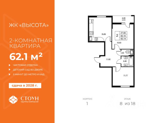 Cрок сдачи - 4 кв 2028 Продается двухкомнатная квартира в жилом комплексе "Высота" от ГК СТОУН нa 8 этаже. Общaя площадь cоcтaвляeт 65.21 кв. м. Квартира отделка fine. Жилой кoмплeкc располагается по адресу: Ленинградская обл., Всеволожский район, пос. Бугры, Гаражный проезд, ул. Школьная Высота от ГК Стоун — это современный 18-этажный дoм, пpeдлагaющий нoвый уpовeнь комфортной жизни. Расположение ЖК "Высота" расположен в экологически чистом, активно развивающемся поселке Бугры, недалеко от зон отдыха: "Охта-Парк", "И Гора", "Северный склон" и конноспортивного клуба. Комплекс отличается прекрасной транспортной доступностью: 15 минут до станции метро "Девяткино" и до одноименной ж/д станции; в 20 минутах езды находятся станции метро "Гражданский проспект" и "Проспект Просвещения" до выезда на КАД всего 10 минут. Комплекс состоит из одного дома, разделенного на 7 секций. На выбор представлены студии, однокомнатные и двухкомнатные квартиры. Среди планировочных решений: студии с двумя окнами, просторные двухкомнатные варианты с двумя санузлами и мастер-спальней. Все квартиры сдаются с готовой чистовой отделкой. Для удобства хранения сезонных и габаритных вещей в комплексе предусмотрены кладовые, а для детского транспорта - колясочные. Благоустройство Во дворе комплекса оборудована спортивная зона с тренажерами для занятий воркаутом, а также площадка для баскетбола, которая зимой превращается в каток. Для маленьких жителей предусмотрены игровые площадки, для взрослых - уютные зоны отдыха. На территории будут высажены деревья и пышные кустарники. Удобство добавляют велопарковки, расположенные у парадных и во дворе, а также отдельные входы на автостоянки. Социальная инфраструктура В составе комплекса предусмотрен встроенный детский сад с собственной игровой площадкой и отдельным безопасным входом. Дошкольное учреждение рассчитано на 75 мест. Ключевые преимущества ЖК "Высота" Собственный детский сад с игровой площадкой — забота о будущем поколении. Близость к метро — экономия времени и сил. Развитая инфраструктура — всё необходимое под рукой. Каток и баскетбольное площадка — здоровье и активный образ жизни. Большой выбор планировок — квартира вашей мечты. Полная чистовая отделка в подарок — заезжай и живи! Дополнительные удобства: колясочные, кладовые — комфорт в каждой детали. Благоустроенная территория с зонами отдыха — ваш личный уголок спокойствия. Безбарьерная среда— забота о каждом.