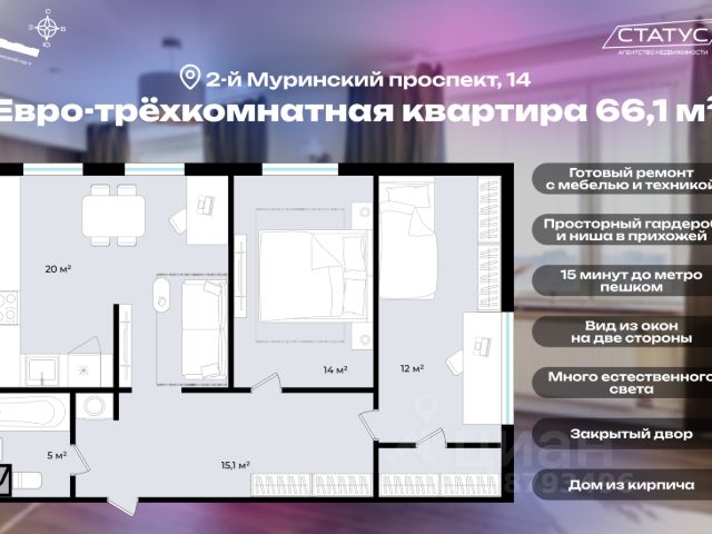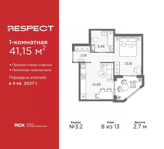 Продается однокомнатная квартира с предчистовой отделкой в ЖК "RESPECT" на 8 этаже. Общая площадь: 41.15 кв.м., жилая: 13.19 кв.м., площадь просторной кухни-столовой: 14.49 кв.м. Все окна выходят на одну сторону. В квартире одна лоджия, один совмещенный санузел. Высота потолков 2.7 м. Дом монолитный, многоподъездный, переменной этажности, от 10 до 13 этажей. Квартира находится в 1-й секции высотой 13 этажей в корпусе 3.2. На этаже 5 квартир. В подъезде 1 пассажирский и 1 грузовой лифт. Начало строительства - 3 квартал 2025 года. Окончание строительства - 4 квартал 2027 года. Оформление сделки по договору долевого участия. В шаговой доступности от жилого комплекса расположены станции метро (расстояние по прямой): "Лесная" (800 м), "Площадь Мужества" (1.4 км), "Выборгская" (1.9 км), также недалеко от этого корпуса находятся станции метро: "Академическая", "Политехническая". Жилой квартал "RESPECT" строится на Полюстровском пр, 87, в одной из самых востребованных локаций Петербурга. В 10 минутах пешком - метро "Лесная" и в 10 минутах на транспорте - Петроградская сторона. Высота домов от 7 до 13 этажей. Квартиры сдаются с отделкой white box и с чистовой отделкой. На территории Respect строится школа на 1125 учащихся и детский сад на 240 мест. Запроектированы собственная газовая котельная, закрытая территория, дворы без машин и подземные паркинги с лифтами. В проекте предусмотрены трапециевидные балконы или остекленные лоджии, которые, с одной стороны, исключают монотонность фасада, являясь декоративными элементами, с другой дополнительным функциональным пространством в квартирах. Цветовая гармония фасадов каждого дома раскрывает характер квартала. Коричневый цвет клинкерного кирпича со структурой водяных штрихов — цвет уюта и безопасности, сдержанности и надёжности. Вентилируемые фасады облицованы клинкерным кирпичом. Его высокая прочность позволяет давать 100 лет гарантии на этот материал. Водопоглощение клинкерного кирпича составляет менее 5%, за счет чего у него высокая теплопроводность и прочность. В квартале запроектированы внутренние закрытые территории дворов домов без доступа автомобилей и безбарьерная среда для велосипедистов и колясок. Предусмотрены IP-домофония с функцией дистанционного открывания калиток и парадных, а также дистанционный сбор показаний счетчиков и мобильное приложение для жителей. Для безопасности жителей квартала - круглосуточное видеонаблюдение и служба охраны. В каждой квартире предусмотрены внешние корзины для кондиционеров. Вся территория квартала будет связана единой концепцией благоустройства, разработанной ландшафтным бюро L.BURO. На эксплуатируемой кровле на уровне первого этажа в домах 1 и 4 будут обустроены общественные видовые террасы. Это станет не только привлекательным местом с красивым видом, но и удобным, многофункциональным пространством. Дизайн парадных зон и входных групп - сочетание лаконичности отделки и декоративных элементов с текстурами из натурального камня и дерева с при