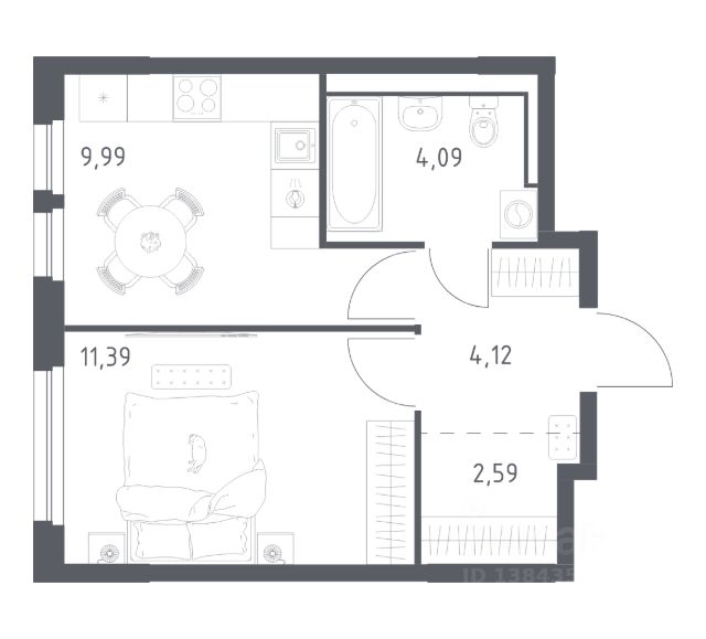 В продаже 1-комнатная квартира в корпусе 6-7 ЖК 'Живи! В Рыбацком'. Квартира располагается на 8 этаже, общая площадь 33.5 м2.