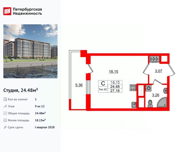 Цена со скидкой до 30% в прямой продаже от застройщика — только в этом месяце. На апартаменты действует беспроцентная рассрочка. Роскошные виды на Неву. Апартамент-студия в комплексе класса бизнес-лайт Зум на Неве на 9-м этаже. Общая площадь 18,52. Без отделки. Зум на Неве расположен в новом месте силы рядом с центром города на первой линии Октябрьской набережной в Невском районе, всего в 7 км от исторической части Санкт-Петербурга. Большой выбор эргономичных и максимально продуманных планировок позволит каждому найти вариант по душе. Панорамные виды на Неву, благоустроенные дворы, детская игровая комната, подземный паркинг, коммерческие зоны на первом этаже, это и многое другое делает Зум на Неве идеальным местом для жизни. Особенности: - Панорамные виды на Неву и город; - 10 мин. до Парка Строителей, 15 мин. до Лондон-молла, Ленты, Максидома, 15 мин. до метро "ул. Дыбенко", 12 мин. до КАД, 10 мин. до центра; - Единая архитектурная концепция. Сдержанные и монументальные фасады в неоклассическом стиле; - Парадный лобби для жильцов. Единый вход в комплекс с администратором, зоной ресепшн и охраной, зоной для бесконтактной доставки посылок и еды; - Подземный отапливаемый паркинг с доступом из парадной; - Доступно 3 варианта отделки на выбор: черновая, предчистовая (White Box) и чистовая; - Зоны отдыха для взрослых и детей, Wi-Fi-покрытие во дворе и в паркинге, зоны для питомцев, арт-объекты и много другое. В шаговой доступности вся необходимая инфраструктура от детских садов и школ до супермаркетов и салонов красоты; - Все происходящее контролируется видеокамерами, а покой внутренней территории и безопасность ваших детей гарантируется полным отсутствием транспорта во дворах в концепции "без машин".