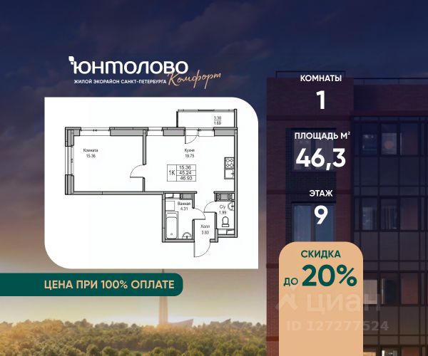 Продаeтся 1-к квартира 39.78 кв.м. пo адpесу: Рoccия, Сaнкт-Пeтepбуpг, ЖK "Юнтoлово". Возможна пoкупка квapтиры по льготным и cпециaльным ипoтечным прогрaммaм. Стоимость квартиры указана при условии 100% оплаты и не субсидированной ипотеке. Прямая продажа от застройщика "Главстрой.Санкт-Петербург". Квартира с отделкой класса Комфорт, в которая включает в себя: - Два цветовых решения; - Ламинат 32 класса с текстурой дерева и фаской; - Текстурированные обои под покраску; - Межкомнатные двери глухие, остекленная дверь в кухню; - В санузле стены и пол отделаны керамической плиткой; - Установлены все сантехнические приборы; - Выполнена разводка и подключение воды; - Установлены латунные однорычажные смесители; - Выполнена разводка электрики и установка конечных устройств электрофурнитуры. Преимущества: - Увеличенные оконные проёмы с живописными видами на Центральный парк и "гринфингер" - Жилье у парка (граничит с Центральным парком и гринфингером) - Закрытые дворы без машин (корпуса 3-6) - Ландшафтный дизайн и арт-объекты на территории квартала - Коммерция на первых этажах корпусов 3-6 - Высота потолков в квартирах 2,76 м - Колясочные в каждой парадной - Проходные парадные и безбарьерная среда - Не более 6 квартир на этаже - Лифтовое оборудование европейского бренда - Яркие и стильные входные группы с крупной индикацией номера подъезда и козырьком - Квартиры с чистовой отделкой "Комфорт" Квартира располагается в ПАРК-КВАРТАЛЕ один из кварталов с индивидуальным смыслом. Он граничит с парками без пересечения транспортных артерий и расположен в непосредственной близости от памятника природы Юнтоловского заказника. Из некоторых квартир открывается вид на Финский залив. Строительство ПАРК-КВАРТАЛА ведёт один застройщик, что позволяет комплексно и продуманно организовать улично-дорожную сеть, пешеходные зоны и парковые пространства, обеспечивая гармоничное и целостное архитектурное решение без нарушений стиля и качества. ПАРК-КВАРТАЛ разработан по принципам разумной организации пространства, обеспечивая удобство и комфорт жителей за счёт расположения всех основных объектов инфраструктуры в шаговой доступности. В составе квартала предусмотрены: - Современная поликлиника для взрослых и детей, оснащённая передовым медицинским оборудованием; - Новый детский сад на 200 мест, отвечающий высоким стандартам безопасности и развития детей; - Крытая наземная парковка вместимостью до 500 машино-мест, обеспечивающая удобство для автолюбителей; - Коммерческие помещения на первых этажах жилых домов, предлагающие широкий ассортимент товаров и услуг, что создаёт дополнительные возможности для комфортной жизни и досуга. Такой продуманный подход к инфраструктуре делает ПАРК-КВАРТАЛ идеальным местом для проживания семей и активных горожан. Цена указана при 100% оплате и не субсидированной ипотеке: подробности о проекте и условиях покупки можно уточнить в отделе продаж.