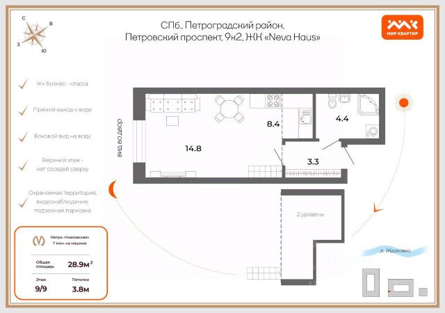 Продаётся 3-комнатная квартира в ЖК "NEVA HAUS" на 9 этаже. Общая площадь составляет 149.80 кв. м. Квартира без отделки. Жилой комплекс "NEVA HAUS" располагается по адресу Санкт-Петербург, Петроградский. NEVA HAUS - элитный жилой комплекс в самой зеленой части Петровского острова, в точке слияния двух рек, напротив Крестовского острова. У жителей появится благоустроенная набережная с пирсом и павильон с необходимыми сервисами и услугами. Потолки до 3,8 м, увеличенные деревянно-алюминиевые окна, современные технические решения, закрытая территория и внутренняя инфраструктура - важные слагаемые качественной жизни в NEVA HAUS. Расположение: • 4 мин на авто до Крестовского острова; • 5 мин на авто до Приморского парка Победы; • 6 мин на авто до станции метро "Крестовский остров"; • 18 мин на авто до ЗСД; • 20 мин на авто до Стрелки В.О. и исторического центра города. NEVA HAUS стал первым элитным жилым комплексом в Санкт-Петербурге, официально получившим статус энергоэффективного, водоэффективного и экологичного объекта по системе GREEN ZOOM. Для удобства жителей, квартира будет подключена к IP-домофонии, на гостевой парковке предусмотрены зарядки для электромобилей. В квартире устроена ниша для размещения кондиционеров, индивидуальные каналы вентиляции, отверстия на фасаде для современных приточно-вытяжных систем, пятиступенчатая очистка воды, коллекторная разводка труб отопления и дерево-алюминиевые окна соответствуют высокому классу жилья. Преимущества: • Высокие потолки, до 3.8м; • Повышенная звукоизоляция между квартирами; • Закрытая охраняемая территория, видеонаблюдение; • Благоустроенная приватная набережная; • Система "Умный дом"; • 5-ти ступенчатая система очистки воды; Успейте приобрести квартиру на выгодных условиях! Чтобы узнать подробности, обращайтесь за консультацией по телефону.