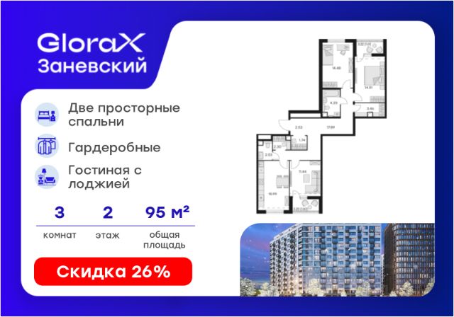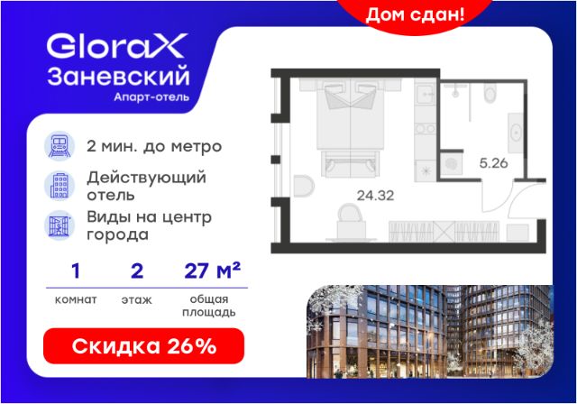 Продается апартамент-студия на 2-м этаже в сданном Апарт-комплексе бизнес-класса "GloraX Заневский". Ключи сразу! Общая площадь лота составляет 29,58 кв. м, из которых 24,32 кв. м отведено под жилую. Номер апартамента - 224. Преимущества: - Полная чистовая отделка - Возможность покупки меблировка и техника - Вход по ключ-карте - Прачечная на 1 этаже - Возможность дозаказа отельного сервиса - Программы доходности - Летний бар и променад - Воркаут площадка - Pet-friendly Апартаменты "GloraX Заневский" - проект бизнес-класса с развитой инфраструктурой, удовлетворяющей все потребности самых взыскательных гостей. Располагается в одном из наиболее перспективных, районов Петербурга в 2х минутах от метро "Ладожская" и в 10 минутах от Невского проспекта. В "GloraX Заневский" есть все, что необходимо для комфортной жизни, работы и отдыха. Инфраструктура, покрывающая все потребности и ожидания собственников и арендаторов. В радиусе 150 метров находятся супермаркеты с возможностью доставки продуктов прямо до дверей апартаментов. На 1000 кв. м. общественных пространств расположится уютный лобби-бар, ресторан мировой кухни на 80 человек и оборудованные коворкинги. В апартаментах "GloraX Заневский" выполнена современная отделка с использованием высококачественных экологичных материалов. В проекте предусмотрен подземный отапливаемый паркинг на 100 мест, куда можно спуститься на лифте прямо от дверей апартаментов. Узнайте подробности в Отделе продаж. Квартира в ипотеку рядом с метро Новочеркасская.