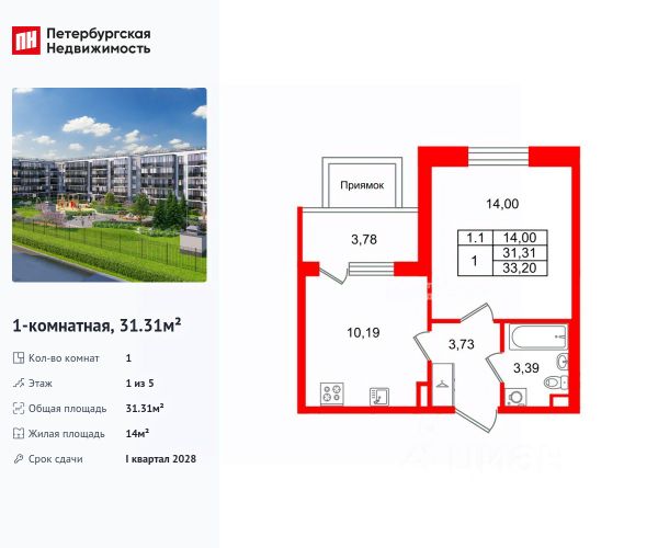 Продается уютная 1-комнатная квартира от застройщика в жилом комплексе "Парадный ансамбль" в престижном Московском районе. До метро можно добраться на транспорте всего за 20 минут. Удобная, классическая планировка, кухня 10.14 м², вместительная прихожая 3.08 м². Общая площадь квартиры - 30.37 м², жилая 14.03 м², высота потолка 3.07 м. Квартира продается с отделкой "NORD LINE WHITE". Что особенного в ЖК "Парадный ансамбль"? • Инновационный Лицей Setl с оригинальной архитектурной концепцией и уникальной образовательной средой • Масштабное малоэтажное строительство в престижном Московском районе • Рекреационные зоны: парадный парк в центре квартала, ручей с собственной набережной, центральная площадь, ресторанный комплекс и пешеходный бульвар • Фасады из керамогранита и кирпича с яркими и акцентными входными группами • Две самые большие площадки Setl Kids и Setl Sport • Уникальные квартиры.High Flat на последних этажах, палисадники у квартир на первом этаже, семейные секции, квартиры с саунами и окном в ванной