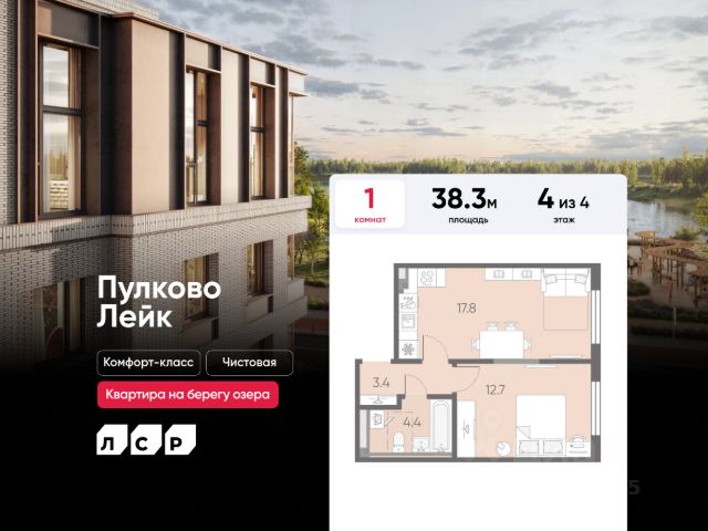 Продается 1-комнатная квартира в ЖК "Пулково Лейк" на 2 этаже. Общая площадь составляет 34.00 кв. м. Квартира с чистовой отделкой. Жилой комплекс "Пулково Лейк" располагается по адресу Санкт-Петербург, Московский. Пулково Лейк - проект малоэтажной застройки на берегу озера на границе Московского и Пушкинского районов. Дома высотой всего 4 этажа, квартиры от уютных студий до трехкомнатных квартир для большой семьи. Широчайший выбор планировок, включая квартиры с мастер-спальнями, патио, каминами, саунами, двухуровневые квартиры. Школа, детские сады, парк на берегу озера и выезды на Пулковское и Петербургское шоссе. Расположение: • 5 мин на авто до Аэропорта Пулково; • 10 мин на авто до станций метро "Московская; • 10-15 мин на авто до городов Пушкина, Павловска и Гатчины; • 20 мин на авто до центра Санкт-Петербурга. Квартиры в проекте сдаются с предчистовой и чистовой отделкой Соmfоrt Stоnе и Соmfоrt Wооd по современным стандартам - Вы можете сами выбрать отделку, подходящую именно Вам. Дома оборудованы самыми современными инженерными системами и "Умным домом". В рамках проекта будет построена современная школа на 925 мест и 2 детских сада на 160 и 240 мест, выезды на Пулковское и Петербургское шоссе, а также храм рядом со сквером "Пулковский рубеж". Общественное пространство вдоль берега озера превратится во всесезонный парк, в котором найдется место для любых активностей от пробежек, катания на САПах и велосипедах до отдыха в шезлонгах и любования закатом солнца. Зимой будет работать каток, проложен лыжный маршрут, предусмотрено место для новогодней елки и горок для детей. Для Ваших питомцев - площадка для выгула собак. Преимущества: • Высота потолков от 2,6 до 4,5 м; • Уникальные планировки; • Парк на берегу озера; • Система "Умный дом"; • Дворы без машин; • Колясочная в парадной; • Видеонаблюдение в холлах, на первом этаже, в лифтах и в паркингах. Успейте приобрести квартиру на выгодных условиях! Чтобы узнать подробности, обращайтесь за консультацией по телефону. Продам квартиру в ипотеку в поселке Шушары в Санкт-Петербурге.