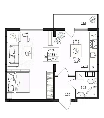 Планировка: кухня-гостиная 16,19 м² и спальня 12,30 м²