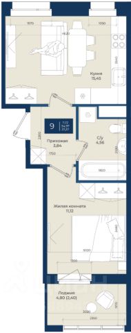 Просторная кухня площадью 13,2 кв.м с выходом на лоджию. Спальня площадью 12,6 кв.м. Совмещенный просторный санузел. Высота потолков 2,70 м. Эргономичная прихожая с местом для вместительной системы хранения.