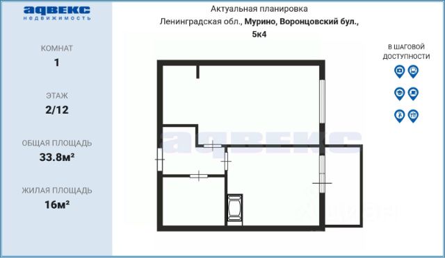 КУПИТЕ Однокомнатную Квартиру в ЖК Мурино в новом развивающимся микрорайоне по адресу: Ленинградская область, Всеволожский муниципальный район, Бугровское сельское поселение, п. Бугры, бульвар Воронцовский, д.5, корп.4 Микрорайон представляет собой современную комплексную застройку с хорошо развитой инфраструктурой. Теплая, солнечная однокомнатная квартира общей площадь 32,8 кв.м., расположена на 1-м этаже 12-ти этажного дома. Квартира подойдет как для собственного проживания, так и для сдачи в аренду. Удобной прямоугольной формы комната площадью - 13,6 кв.м. Вместительный встроенный шкаф обязательно порадует хозяйку. Форма комнаты позволяет выделить функциональные зоны для отдыха и работы. Кухня 10,2 кв.м. с выходом на широкую лоджию, где можно посидеть за чашечкой ароматного кофе и насладиться видом на зеленый двор. Большой совмещенный санузел с поперечной ванной, где удобно вместится стиральная машина. Во всей квартире установлены стеклопакеты. Окна квартиры выходят в тихий зеленый двор. Много места для парковки рядом с домом - это приятно, когда вечером после работы не надо выискивать место для своего автомобиля. Двор с благоустроенными детскими площадками. Район со сложившейся инфраструктурой. В пяти минутах ходьбы от дома множество сетевых магазинов, аптеки, кафе, рестораны, салоны красоты, банки, фитнес-клубы, большой выбор детских садов и школ, поликлиника - все необходимое для комфортного проживания в шаговой доступности. Хорошая транспортная доступность и удобное транспортное сообщение. Рядом остановки автобусов - 15 минут недалеко от метро Девяткино. Близость к дорожным развязкам, что удобно для поездки в город и выезда за город. Позвоните узнать подробности и договориться на просмотр.